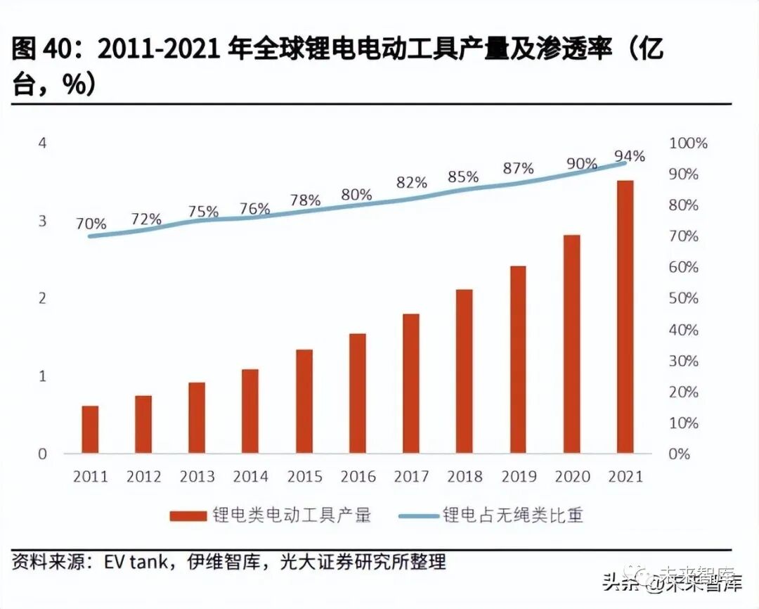 電動工具發展趨向無繩化,鋰電工具滲透率提高。根據 EVTank 數據,從市場 規模來看,2021 年全球電動工具市場規模達到 636.9 億美元,從出貨量來看, 2011-2021 年全球電動工具市場出貨量由 3.0 億臺增長至 5.8 億臺,CAGR 約 為 6.8%。近年來,得益于電動工具小型化、便利化的發展趨勢和鋰電池低成 本、高能量密度、長循環壽命的優勢,電動工具趨向無繩化發展,無繩類電動 工具產量逐步提高。根據 EVTank 數據,2011 年全球無繩類電動工具出貨量約 為 0.89 億臺,占全球電動工具總出貨量約 29.8%,2021 年無繩類電動工具出 貨量達到 3.77 億臺,占總出貨量約 65.0%,2011-2021 年無繩類電動工具出 貨量 CAGR 達到 15.5%,相比之下有繩類電動工具產量從 2.1 億臺減少到 2.0 億臺,CAGR 為負。電動工具無繩化趨勢帶動鋰電工具產量和滲透率迅速上 升,2011-2021 年全球鋰電電動工具產量從 0.63 億臺提高到 3.53 億臺,CAGR約為 18.87%,2021 年鋰電工具產量占無繩類電動工具產量約 93.5%,呈現迅 速增長的趨勢。