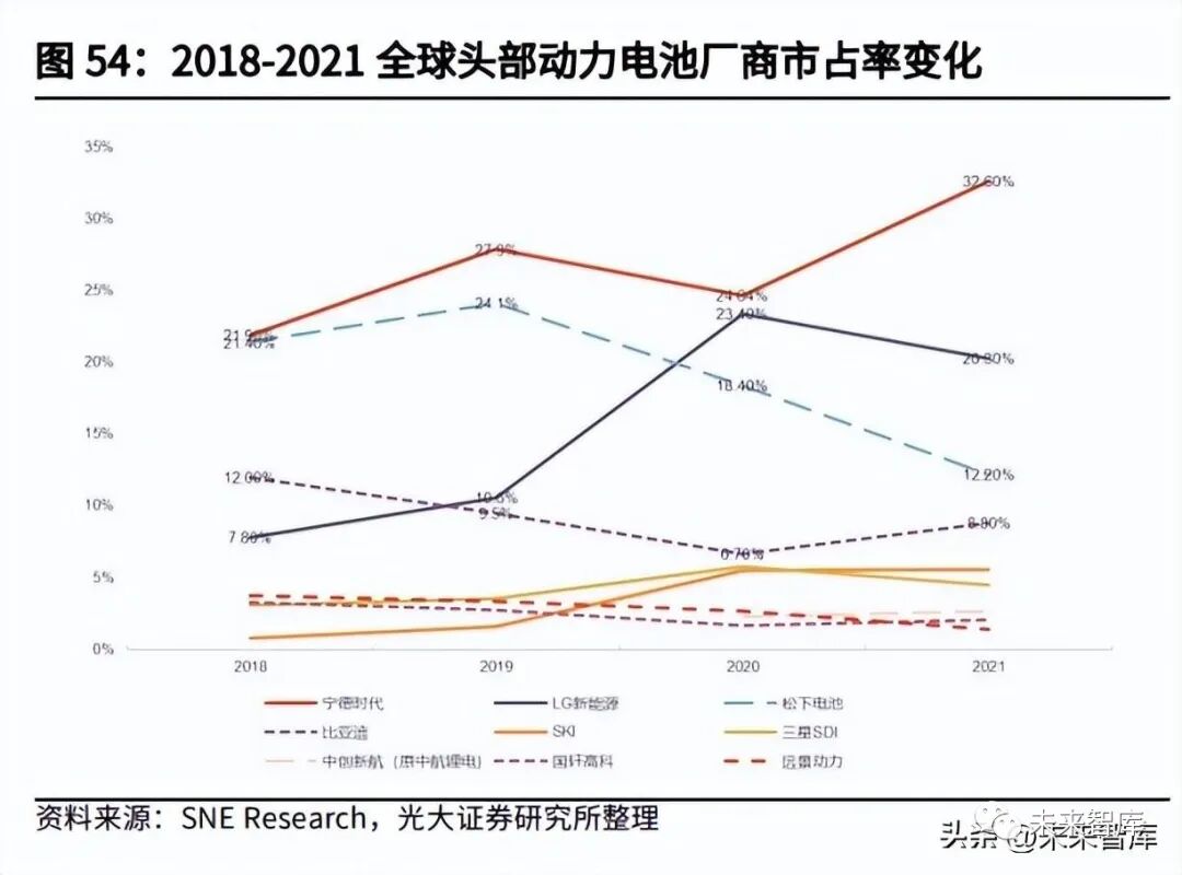 在全球范圍內,動力電池市場的集中度較高,2021 年前三大廠商裝機量份額達 到 65.1%,CR10 突破 90%,寧德時代、松下電池與 LG 新能源三足鼎立。位 列前十的電池廠商均為中日韓企業,2021 年中國電池廠商占據五席,包括寧德 時代、比亞迪、中創新航、國軒高科與遠景動力。寧德時代連續四年占據全球 動力電池裝機量榜首,2021 年海外客戶放量帶動出貨量提升,全球動力電池裝 機量達到 96.7GWh,較上年同比增長 167.13%,市占率達 32.6%,較上年提 升 8 個百分點,龍頭地位進一步鞏固。全球動力電池市場份額不斷向頭部廠商 集中,CR3 從 2018 年的 55.3%提升至 2021 年的 65.1%,CR10 由 2018 年的 81.4%提升至 2021 年的 91.2%。