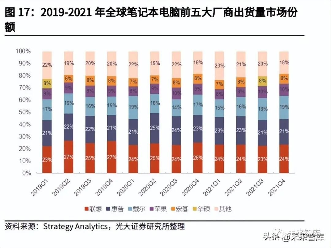 筆記本電腦方面,全球筆記本電腦市場逐漸飽和,總體增長趨于穩定。根據 Trendforce 數據,由于智能手持設備對市場的沖擊,全球筆記本電腦 2015 年2018 年的出貨量整體維持平穩,年均約 1.63 億臺。新冠疫情期間,遠程辦公 和網絡教學模式普及,帶動筆電銷量大增。根據 Strategy Analytics, 2021 年 全球筆記本電腦出貨量達到 2.68 億臺,同比增長 18.06%,預計未來一段時間 內增速放緩,但需求仍將維持高位。筆記本電腦市場競爭格局較為集中,惠普、聯想、戴爾、蘋果等頭部品牌廠商 市場占有率較高,華為、小米等國內廠商相繼進入。根據 Strategy Analytics 統計,2019Q1 至 2021Q4,全球筆記本電腦前五大廠商出貨量合計占比均位于 75%以上,聯想、惠普、戴爾、蘋果、華碩及宏碁等廠商市場地位穩定。未來 頭部品牌研發能力與產品力提高,預計市場集中度將進一步提升。