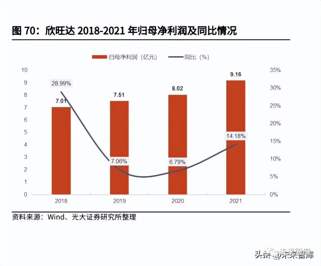 公司概況:欣旺達電子股份有限公司創立于 1997 年,以鋰電池模組研發、設 計、生產及銷售為主營業務,于 2011 年登陸深交所創業板。歷經二十余年, 公司發展成為全球鋰離子電池領域的領軍企業,形成了 3C 消費類電池、智能 硬件、電動汽車電池、儲能系統與能源互聯網、智能制造與工業互聯網、第三 方檢測服務六大產業群。公司于 2008 年開始正式布局電動汽車電池業務,以 電動汽車電池系統(電芯、模組、BMS 和 PACK)為產品核心,上游延伸到礦 產原材料、電芯正負極材料等關鍵環節,下游延伸至電動汽車、儲能電站、動 力電池梯次利用等產業,進行全產業鏈一體化布局。公司 2021 年的營業總收入為 373.59 億元,同比增長 25.82%,歸母凈利潤約 為 9.16 億元,同比增長 14.18%,扣非歸母凈利潤約為 5.28 億元,同比增長 101.72%,毛利率為 14.69%,凈利率為 2.29%。公司 2022 年上半年的營業總 收入為 217.18 億元,同比增長 38.49%,歸母凈利潤約為 3.72 億元,同比下 降 39.72%,扣非歸母凈利潤約為 2.47 億元,同比增長 11%,毛利率為 13.76%,凈利率為 1.07%。受原材料價格上漲影響,成本壓力增大致使利潤端 承壓。公司 2021 年手機數碼類業務在總收入中占比約 55.7%,筆記本電腦類業務在 總收入中占比約 14.5%,電動汽車電池類業務在總收入中占比約 7.9%,精密 結構件業務在總收入中占比約 5.8%,智能硬件業務在總收入中占比約 13.4%,其他業務在總收入中占比約 2.7%。