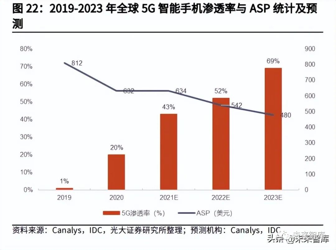2011 年起,智能手機銷量連續 5 年保持高速增長,年均復合增長率達到 20%;隨著智能手機整體性能提升,換機周期延長,滲透率逐步見頂,2017 年 起全球智能手機出貨量連續四年出現負增長,進入存量市場。在全球市場,未來 5G、折疊屏和全面屏等新技術的出現將加速智能手機產品的 更新換代,亞非國家市場逐步開拓,全球智能手機出貨量仍有增長空間。根據 IDC 數據,2021 年全球智能手機出貨量達 13.548 億臺,同比增長 5.7%,預計 未來五年內保持持續增長。Counterpoint Research 數據顯示,2022 年 1 月全球 5G 智能手機的銷量占所有智能手機銷量的 51%,歷史上首次過半。根據 Canalys 預測,隨全球 5G 智能手機的稅后平均售價(ASP)逐漸下降,2023 年全球 5G 手機滲透率將達到 69%,存量替換創造行業新增長點。在地域層 面,非洲、南亞等地智能手機滲透率仍處于較低水平,未來新興市場國家人均 收入不斷提升、移動通信基礎設施不斷完善,有望創造增量需求。以非洲為 例,據 GSMA 的數據,2020 年撒哈拉以南非洲智能機滲透率僅為 48%,預計 到 2025 年該比例將達到 64%。