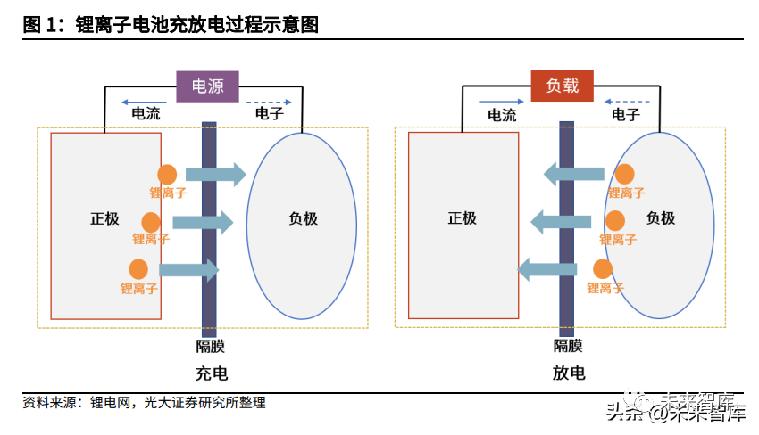 鋰離子電池是一種二次電池(充電電池),主要依靠鋰離子在正極和負極之間 移動來工作。在充放電過程中,Li+在兩個電極之間往返嵌入和脫嵌:充電時, Li+從正極脫嵌,經過電解質嵌入負極,負極處于富鋰狀態;放電時則相反。