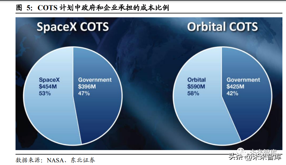 美國商業航天的崛起繞不過 COTS 計劃,這也是美國從計劃航天向商業行業轉型的 重要 拐點之一。COTS 計劃(商業軌道運輸服務計劃 ,Commercial Orbital Transportation Services)在節省了政府財政預算的同時,也催化除了像 SpaceX 這樣 的優秀企業。美國前總統小布什于 2004 年制定了《美國太空探索政策》,該政策呼 吁在 2020 年重返月球,航天飛機也于 2010 年底退役。但是事實上,NASA 在航天 飛機退役后,自己手上已經沒有將航天器運送至太空的能力了,市場上的德爾塔 4 和宇宙神 5 都是空軍的,美國政府在 NASA 上投入的研制經費與之前比也少了很 多。2005 年 NASA 為了完成探索計劃,在美國私營企業尋找能夠滿足國際空間站貨 運以及最終的載人需求。同時 NASA 還計劃將在五年內撥款 5 億美元,以刺激商業 能力的發展,這既是 COTS 計劃的雛形。