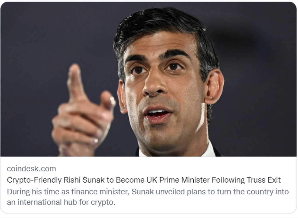 里希·蘇納克當選英國新首相,蘇納克對加密貨幣、區塊鏈和分布式賬本技術一直持積極看法,致力于使加密貨幣正常化并將其納入英國經濟。他一直致力于推動采用英鎊穩定幣,這可能會在某種程度上保持英鎊在數字經濟中的全球性。其在擔任財政大臣期間曾說,“我的理想是讓英國成為全球加密資產技術的中心”。他的任命很可能導致英國加密貨幣政策變化。