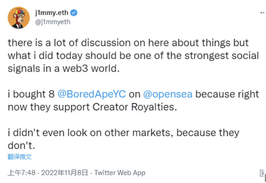 11月6日消息,OpenSea在官方博客中宣布即將為新 NFT 系列推出可選的鏈上版稅強制執行工具,旨在通過賦予創造者更多的權力,讓他們擁有能夠控制自己的商業模式的工具來捍衛創作者權益。OpenSea首次推出工具幫助新NFT系列創作者強制執行鏈上版稅,該工具將于 11 月 9 日 0:00 首次啟動,OpenSea 表示希望“對這個話題采取深思熟慮、有原則的方法”,此前市場參與者就強制向創作者付費的正確做法展開了曠日持久的辯論。情報員評論:新的項目方就有點難了,沒法既要又要的,得站隊了情報來源:https://www.theblock.co/post/183518/opensea-creates-tool-to-help-nft-collections-enforce-royalties-on-chain