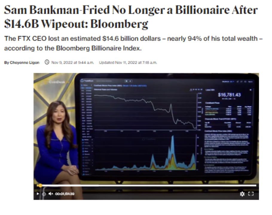 SBF凈資產146億暴跌近94%跌至9.915億美元,創下彭博社億萬富翁指數中單日最大跌幅 FTX首席執行官Sam Bankman-Fried已從彭博社追蹤的億萬富翁指數中消失。在FTX現金緊縮之前,SBF身家估計為156億美元,據彭博社報道,146億美元在一夜之間蒸發,估計他個人財富在一天內暴跌近94%至9.915億美元,創下彭博社億萬富翁指數中單日最大跌幅。 此外,以太坊創始人Vitalik Buterin在相關話題下回應稱,“10億美元仍然比我擁有的多得多”。情報來源:https://www.coindesk.com/business/2022/11/08/sam-bankman-fried-no-longer-a-billionaire-after-146b-wipeout-bloomberg/