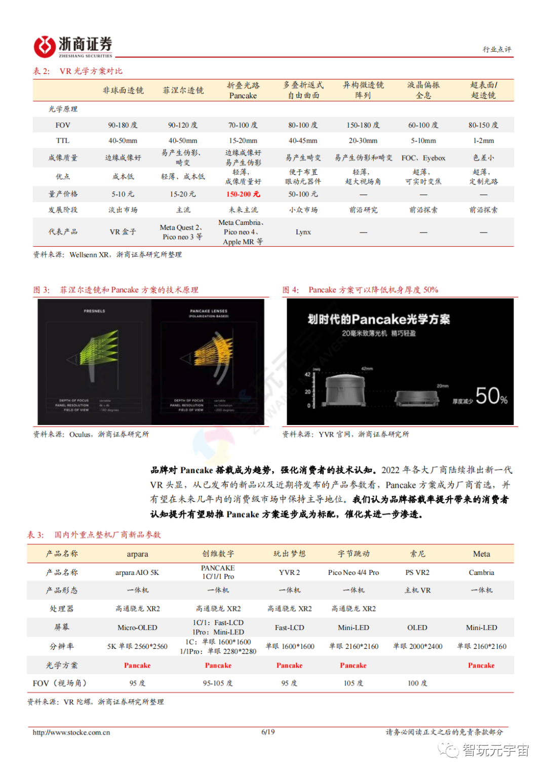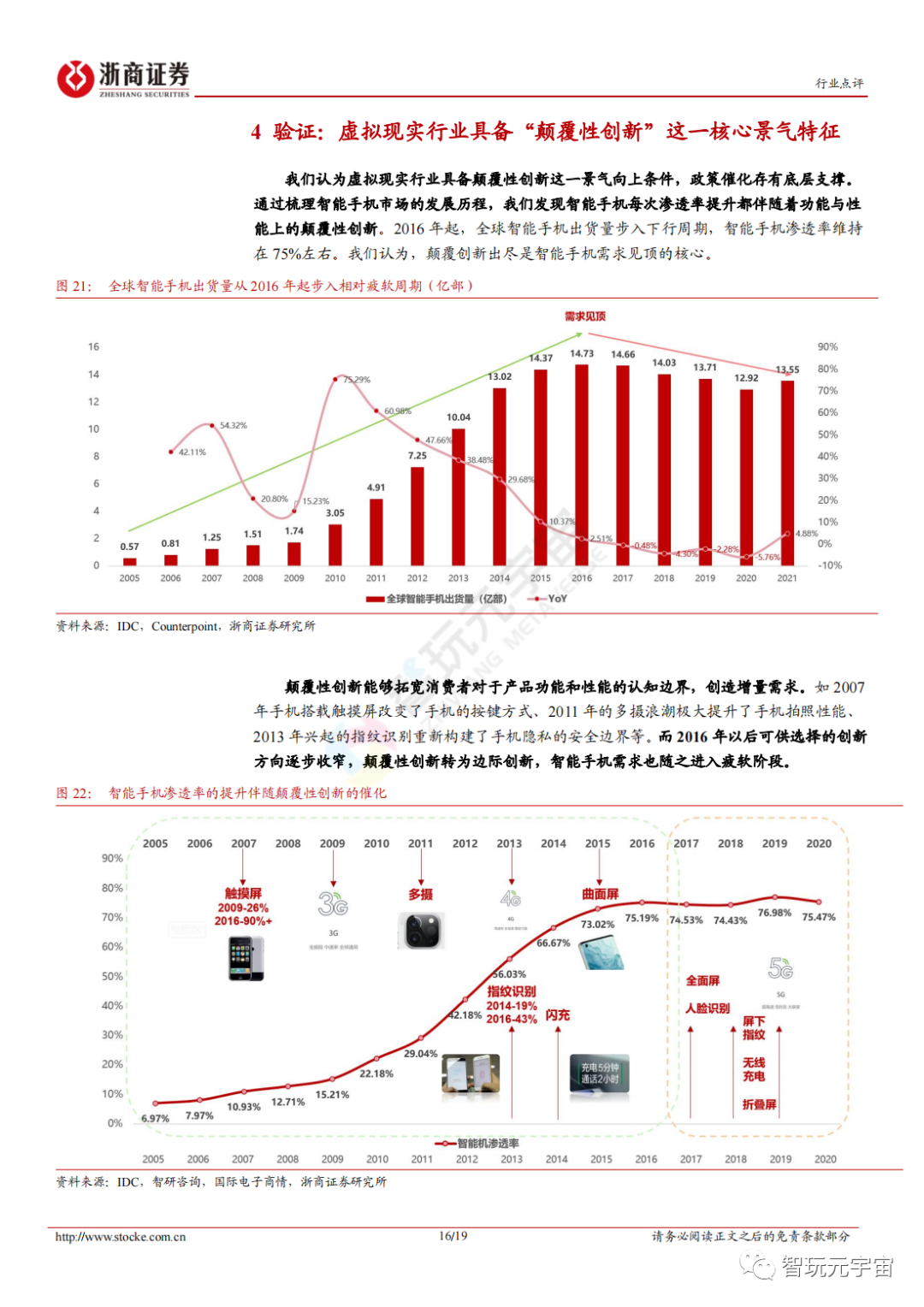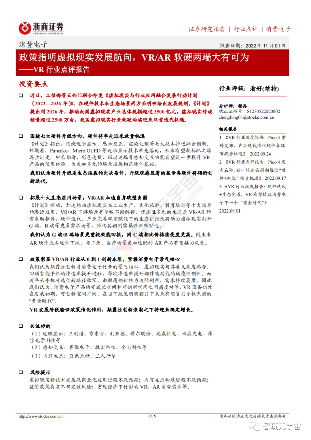 近日,工信部等五部門聯合印發《虛擬現實與行業應用融合發展行動計劃(2022—2026 年)》,在硬件技術和生態場景兩方面明確給出發展規劃。《計劃》提出到 2026 年,推動我國虛擬現實產業總體規模超過 3500 億元,虛擬現實終端銷量超過 2500 萬臺,我國虛擬現實行業軟硬兩端迎來雙重迭代機遇。《計劃》指出,圍繞近眼顯示、感知交互、渲染處理等七大技術推進融合創新。短期看,Pancake、Micro OLED 等近眼顯示技術率先落地,未來有望朝標配之路逐步進發;中長期看,彩色透視、眼動追蹤等感知交互功能有望進一步提升 VR產品的使用體驗,為更加多元的場景延展構筑硬件基礎。我們認為硬件升級是生態延展的先決條件,升級觀感顯著的顯示類硬件將領銜創新迭代。拓展十大生態應用場景,VR/AR 加速自身破壁出圈《計劃》明確,加速推動虛擬現實在工業生產、文化旅游、教育培訓等十大場景的滲透應用,VR/AR 下游場景有望被不斷解鎖。優質且多元的生態是 VR/AR 的需求助推器,硬件迭代、產業完善雙重賦能下的生態擴張或將助力虛擬現實打開G 端、B 端等更多需求場景,催化其朝剛需屬性不斷貼近。我們認為 G 端/B 端場景更重視效能回報,同 C 端相比價格接受度更高。隨未來AR 硬件成本逐步下探,與工業、醫療場景更加適配的 AR 產品有望接力放量。政策彰顯 VR/AR 行業從 0 到 1 創新本質,緊握消費電子景氣核心我們認為顛覆性創新是消費電子行業的景氣核心,虛擬現實與其要義高度貼合。回顧智能手機的滲透率提升過程,每次滲透率提升都伴隨功能的顛覆性創新。而近年來手機可選創新路徑收窄,由顛覆創新轉為邊際創新,需求持續萎靡。因此我們認為,消費電子產品的可成長空間和可創新空間之間高度對等,VR 設備仍處在發展初期,可創新空間廣闊,在當下政策明確指引下未來有望復刻手機先前的“黃金時代”。VR 發展階段驗證政策催化作用,顛覆性創新浪潮之下將迎來確定增長。![]()