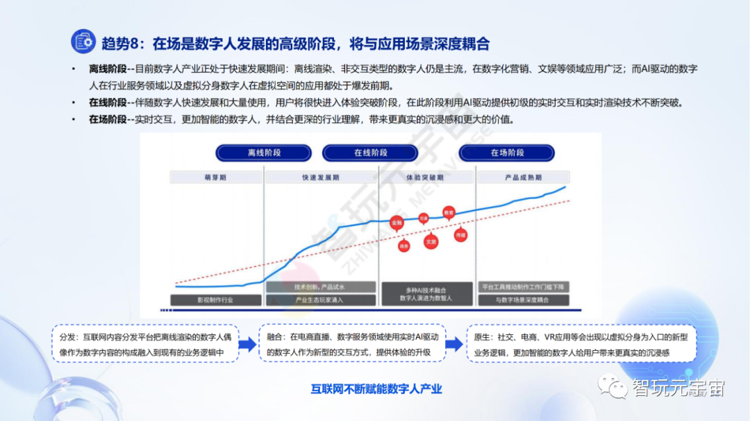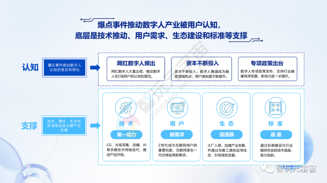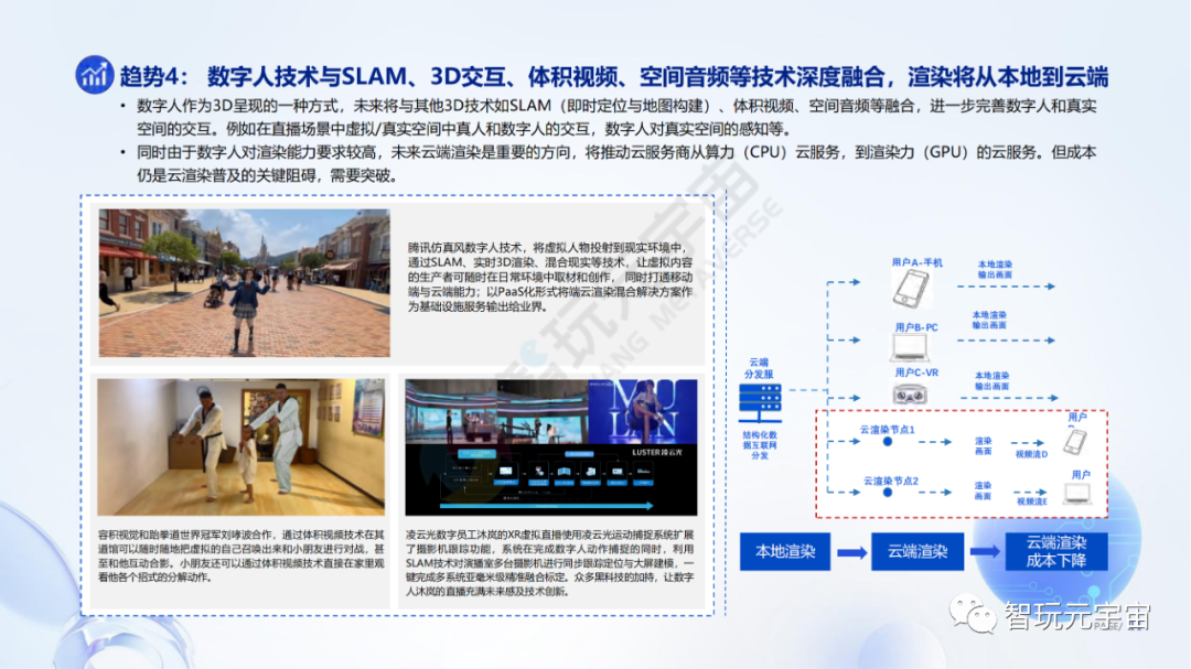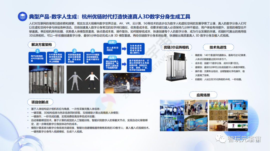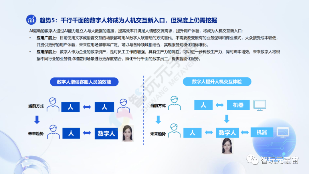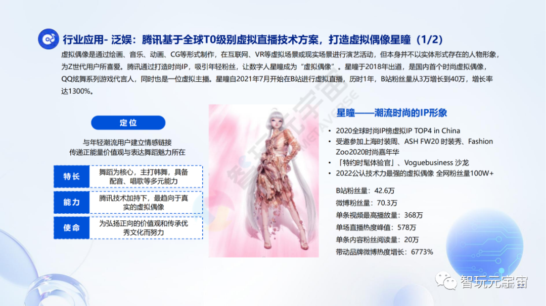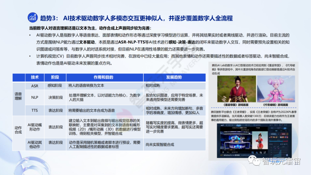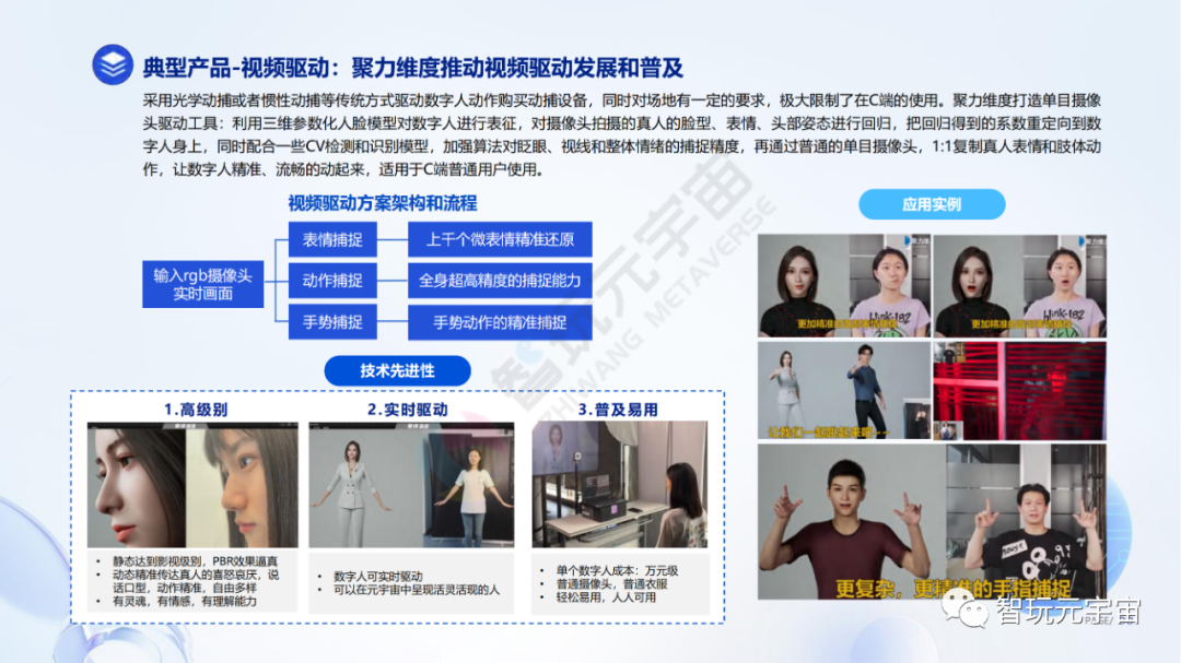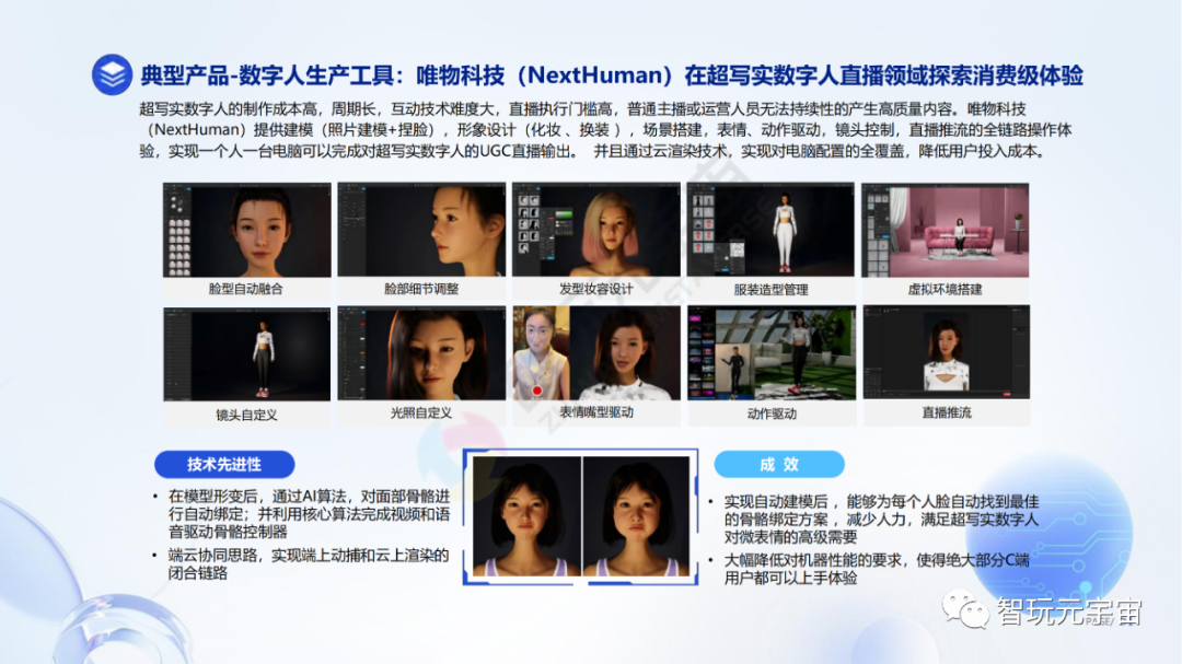 數字人是當下最前沿、最時尚的前沿技術產品,他不僅有逼真的人的外貌,還能很好地模擬人的行為,而且具備了一定程度的人的思想。數字人也是一個技術和藝術的完美融合體。在技術維度上,數字人是多種前沿科技的集大成者;在藝術上,數字人的制作和表現也需要極高的審美。數字人起源于電影行業,早在本世紀初,數字人的相關技術就在《指環王》、《阿凡達》等電影中大量使用了。隨著游戲科技的發展,游戲中的一些建模、綁定,動捕,渲染、AI語音識別、圖像識別等技術開始賦能數字人產業,極大地提高了數字人的制作效能。從2020年開始,大量的網紅數字人出現,尤其2022年冬奧會,數字人在手語解說,節目直播等眾多場合亮相,推動了公眾對數字人的認知普及,進一步推動了產業的發展。為全面把握數字人產業發展的前沿趨勢,騰訊研究院、騰訊云智能和創業黑馬聯合,先后訪談了數十家從事數字人的創新企業,從價值定位、核心技術、行業應用、C端發展、產業聚集、未來挑戰等十個不同維度進行剖析,深度解析產業發展的現狀,驅動力、挑戰和未來走向。在研究過程中,項目團隊也發現了大量的優秀產品、解決方案和行業應用。我們發現,數字人產業日臻成熟,進入了新的發展階段,其表現為:不同類型的數字人定位明確,生成工具逐漸完善,制作流程管線化,AI驅動的數字人已經在行業中大范圍應用。在報告撰寫過程中,我們也在進一步思考。誠然,數字人產業的發展,不可避免地涉及了更廣泛的產業和社會議題,如,數字人是否是用戶的剛需?是否幫助人們緩解了孤獨感、帶來更多溫暖? 對于數字人這種新技術的產物,是否也一些肖像權、倫理道德等潛在問題?我們應該如何看待,是否需要讓子彈飛一會?展望未來,數字人會正朝幾個方向加速迭代:一是外貌更加精致,形象更加逼真,動作更加自然,即“皮囊更好看”,跨越恐怖谷效應后,會使人覺得數字人和真人無異,有利于建立良好的心理連接;二是隨著AI技術的不斷完善,數字人多模態感知和交互的能力會得到顯著提升,數字人未來有可能具備記憶力和判斷力,從而更加智能,行為和思想上更趨于接近人,擁有“有趣的靈魂”。此外,數字人產業的加速發展,也需要渲染、動捕等行業開發工具、云渲染等技術支持體系的進一步完善,從而大幅提升制作效能,有效降低制作時間和成本。目前,很多技術已經接近商業化大規模推廣的臨界點,數字人產業有望進入全真互聯的新階段。在未來,數字人將可能作為我們的分身,成為數字世界的交互入口,為我們帶來更智能、更沉浸的“在場”體驗。![]()