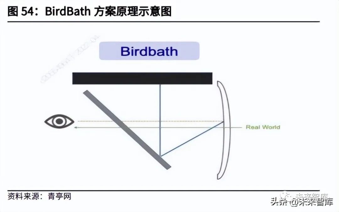 自由曲面和 BirdBath 小幅改善鏡片厚度、其他性能良好、量產制造成熟,成 為近幾年的過渡方案。1) 自由曲面方案由表面形狀不能被連續加工、具有傳統加工成型的任意性曲 面擔當反射鏡,對顯示屏光線進行準直和成像,因此成像質量較高,色彩 飽和度和光學效率表現優秀。但自由曲面結構局部精度低,帶來低分辨率 和畫面扭曲,使得現實世界和虛擬世界光線傳遞時存在畸變現象;2) BirdBath 方案下,顯示屏光線經 45 度角的分光鏡反射至曲面鏡彈射入眼, 而現實光線透過曲面鏡和分光鏡入眼。光學結構簡單,光效高、視場角大;但眼動范圍受限,同時透射入眼面臨圖像畸變、光線透過率低的缺點。自由曲面和 BirdBath 光學結構相對簡單,一方面光效高,顯示屏選擇靈活, 另一方面制造難度低,可以較低成本規模量產,成為目前中低端或消費級 AR 眼鏡的主要光學方案。但其他性能一般,存在畸變等問題,致命的是,為實現 可用視場角,鏡片厚度壓縮極限為 8mm,無法做到日常眼鏡般的輕薄機身。