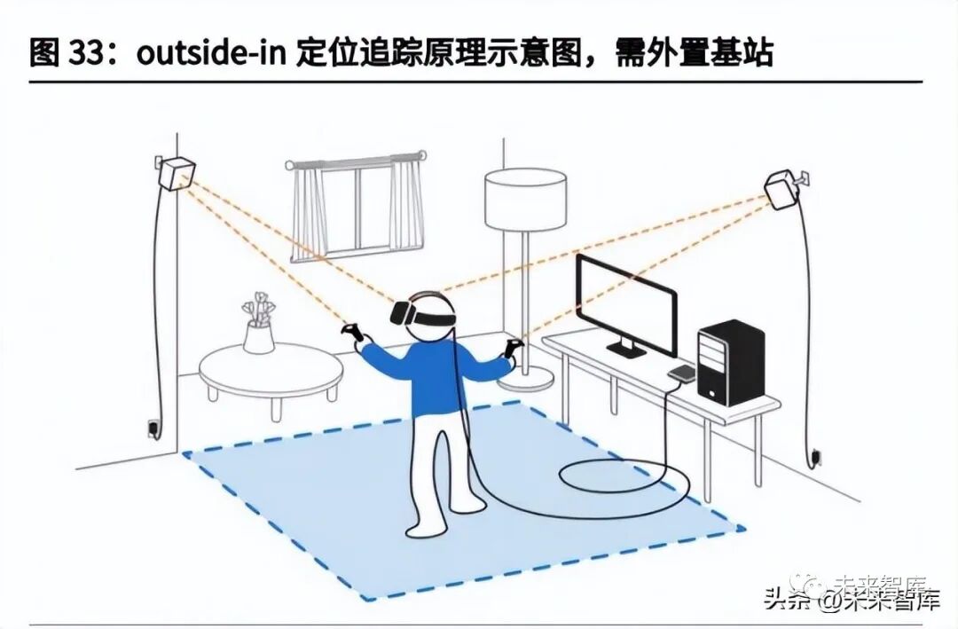 價格成為消費級滲透關鍵,驅動定位技術由 outside-in 向 inside-out 演進。追 蹤定位原理是“信號源+傳感器”,其中 outside-in 需設外置基站作信號源, inside-out 則將信號源和傳感器集成至頭顯處。無額外基站的 inside-out 方案 具備價格優勢和便捷性,成為主流方案。多傳感器融合和算法升級,幫助 inside-out 性能趨近 outside-in。不同于 outside-in 在激光、紅外和可見光等 技術路徑中擇一使用,inside-out 集成黑白、RGB、深度相機等攝像頭,使用 超聲、激光、電磁、慣性等多種傳感器融合定位,加上 SLAM 算法的日漸精進, 幫助提高精度和降低功耗,效果趨近 outside-in,實現頭手 6DoF 效果。