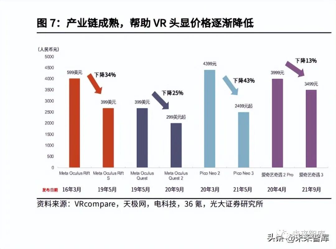 制造:功能和技術路徑趨于統一,供應鏈成熟助力成本下降。1) 產品形態:除智能終端廠商如索尼和華為仍對原有分體式 VR 產品系列迭代, 具備獨立算力、顯示和交互的一體式 VR 頭顯成為 VR 主流形態;2) 產品功能:當前產品交互功能趨同,普遍搭載 4 個攝像頭、采用 insideout 空間定位技術以及頭部和雙手 6DoF 追蹤位移;支持瞳距和屈光度調節, 適配不同臉型和近視人士;同時,一體化頭顯采用 Wi-Fi 6 連接技術,實現 無線串流功能;3) 技術方案:處理器、光學透鏡、顯示屏等核心元器件方案基本統一。高通 驍龍 XR2 成為主力芯片;菲涅爾透鏡光學+Fast LCD 顯示方案成熟支持大 規模量產,超短焦光學+Micro-OLED/LED 顯示的技術迭代方向清晰。Oculus Quest 2 的暢銷使其他廠商效仿采用其零部件,推動供應鏈完善。我們認為,以上趨同趨勢,在供應端,有助于上游核心零部件規格統一,促進 產業鏈逐步成熟,有利于降低零部件及整機成本的生產成本;在需求端,成本 降低助力新頭顯價格持續下降,有望進一步提升消費級市場滲透率。