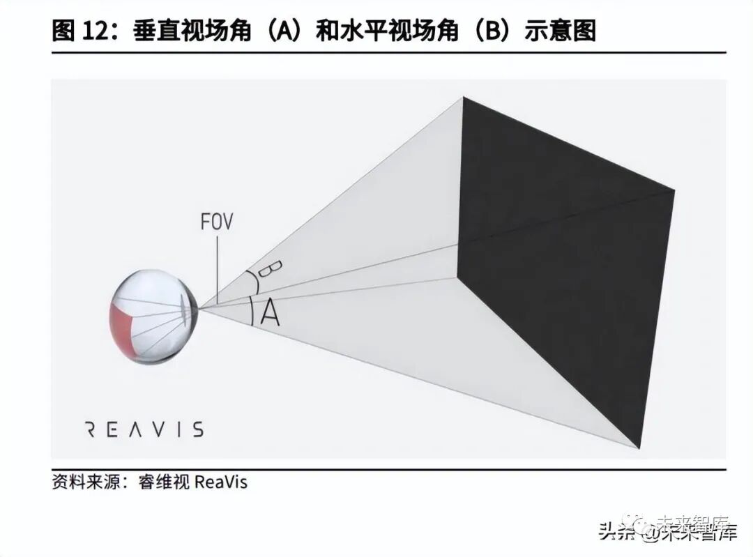 光學模組實現近距離成像,是 VR 與手機等 2D 屏幕的主要區別。以下性能指標 被光學模組決定,影響沉浸感和舒適性,成為選擇光學方案的關鍵考量:1) 視場角 FOV,即視野范圍。視場角是最為關鍵的 VR 參數之一,人類雙眼 視場角最大可達 200°,為實現完全沉浸 VR 頭顯的視場角應接近人眼;2) 光學效率。光線穿過透鏡、反射、折射直至入眼的過程,未被損耗的比例;3) 透鏡厚度。舒適性需求要求頭顯輕薄化,對透鏡的厚度和重量帶來要求;4) 成像質量。出現圖像畸變(變形,與實物不符導致失真感)和雜光現象 (除成像光線,其他非成像光線在光學系統上面擴散,導致光斑)等問題。