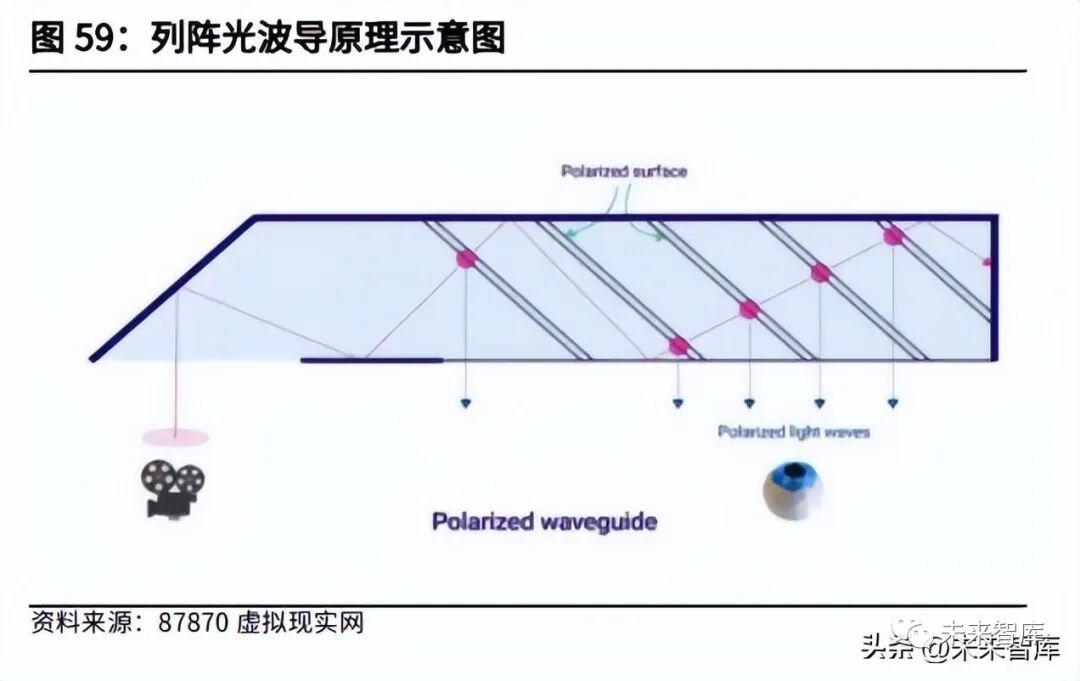 陣列光波導利用鏡片陣列,成像質量和光效突出。光線經過由多個鏡面組成的 陣列時,光線分部分通過各層鏡片,逐漸被反射出瞳,這使得光線和色彩被 “調整”均勻,在成像效果上具備突出優勢:1) 色彩:全反射下光的信息是連續量,光學設計上對紅綠藍三色的效率存在 解析解,因此保障色彩的精準度和均勻性,色彩豐富,對比度高;2) 色散:光的全反射不存在色散問題;3) 光效:光的全反射不造成光路損耗,因此光效水平高。陣列光波導缺陷在于眼動范圍受限,二維擴瞳不完善且制造難度加大。多個鏡 面將光束分批反射,但僅在一維 x 軸擴瞳,而 y 軸信息有限,導致眼動范圍水 平大、垂直小。考慮到 C 端應用場景豐富,眼動范圍需要在 x 軸和 y 軸均有較 大活動范圍,因此消費級 AR 的鏡片需要具備二維擴瞳技術。目前廠商在積極 研發二維擴瞳,取得一定進展,但會使技術設計和制造工藝難度增大。