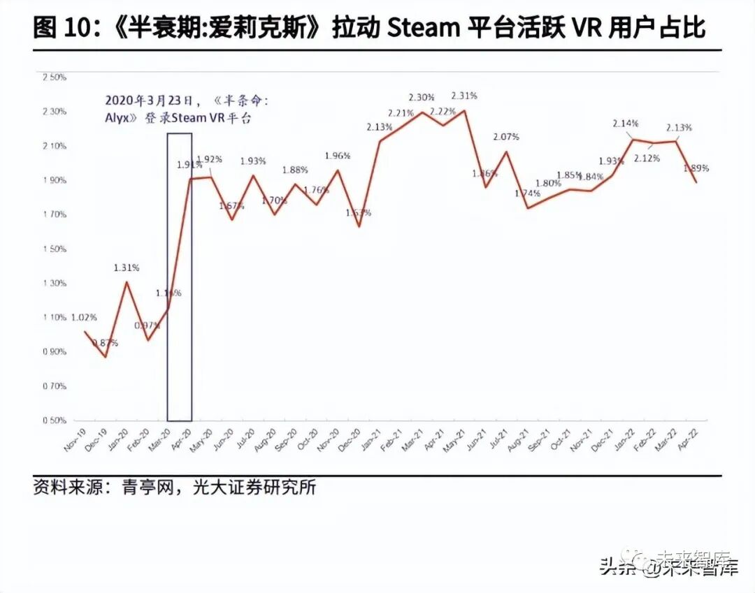 當前 VR 頭顯出貨量受內容短板的掣肘,應用軟件的豐富度提升和 VR 應用場景 的拓展能為 VR 硬件創造更多需求;另一方面,硬件性能提升利好應用形式和 范圍的拓展。硬件和軟件協同發展,雙螺旋推動。VR 虛擬視覺、高沉浸和強交互的特性使其適配游戲、流媒體、社交、辦公等 C 端文娛場景和工業設計等少數 B 端應用,定位下一代媒介形式與流量入口。游戲內容生產進入良性循環,優質 VR 游戲拉動效果明顯。標桿性游戲《半衰 期:愛莉克斯》帶動硬件出貨量,該游戲上線后 Steam 平臺 VR 接入數量一個月 內新增 95 萬,增至 270 萬臺。VR 頭顯用戶保有量提升,游戲開發者開始盈利, 截至 22 年 2 月,Oculus Quest 營收超 10 億美元,其中 8 款游戲銷售額超2000 萬美元。目前 VR 游戲頭部效應突出,短期優質內容主要來源知名 IP 的 VR 化續作,隨著硬件-內容良性循環的建立,看好未來游戲豐富度進一步提升。