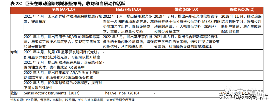 雖技術突破面臨困難,隨著科技巨頭和 VR 頭顯廠商重點布局,眼動追蹤技術 在技術指標和制造成本上持續改善,未來將作為成熟技術成為 VR 頭顯標配。巨頭因重要戰略作用積極布局眼動追蹤領域,收購和自研以提升技術性能表現。雖 Tobii 和七鑫易維等頭部公司已實現量產落地,巨頭很早便開始對關鍵眼動 追蹤技術進行自研,均在 2016-2017 年收購相關初創公司,并利用其技術持續 深入研發,近幾年頻頻發布相關專利,分別通過改進算法和硬件來提升精度、 降低功耗和成本以及增強針對不同人眼的適配性,并且在注視點渲染、視覺調 節、眼動交互、面部重塑等下游應用領域產生一定研發成果。