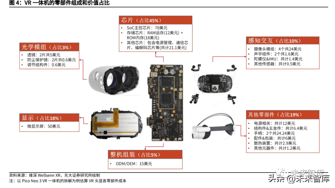 VR 芯片成本占比近半,光學和顯示承擔圖像呈現功能。以 Pico neo 3 VR 一體 機為例,芯片獨立計算和存儲,算力和編解碼要求高,占總成本的 45%。顯示 屏發出圖像光線,由光學模組放大后耦入人眼,兩者分別占總成本的 3%和 18%。目前光學使用菲涅爾透鏡(成本 5 美元),若切換至超短焦(成本約 30-40 美元)有望將光學占比提升至 10%以上。感知交互成本主要來自于攝像 頭,與光學產業鏈有部分重疊。除零部件性能迭代外,VR 需兼顧沉浸感、交互 性、舒適性和經濟性,工程化設計實現全局最優。
