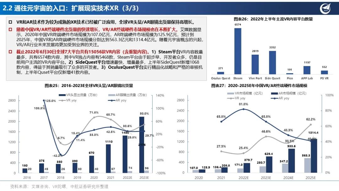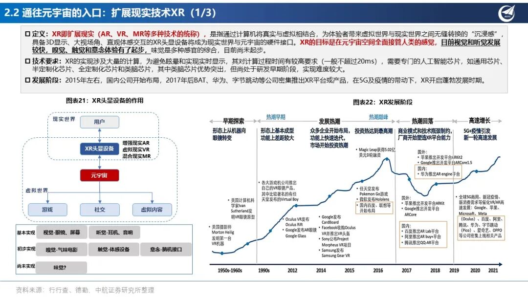 ②拓展現實技術XR(通往元宇宙的入口):1)定義:XR即擴展現實(AR、VR、MR等多種技術的統稱),是指通過計算機將真實與虛擬相結合,為體驗者帶來虛擬世界與現實世界之間無縫轉換的“沉浸感”,具備3D顯示、大視場角、直觀體感交互的XR頭顯設備將成為現實世界與元宇宙的硬件接口。2)市場規模:艾媒數據顯示,2020年中國VR/AR終端硬件市場規模分別為107.0/125.9億元,預計到2025年,中國VR/AR終端硬件市場規模分別達到563.3/1314.4億元。