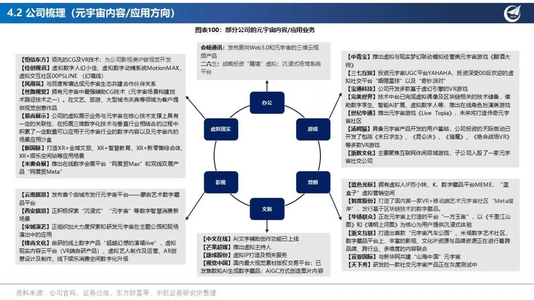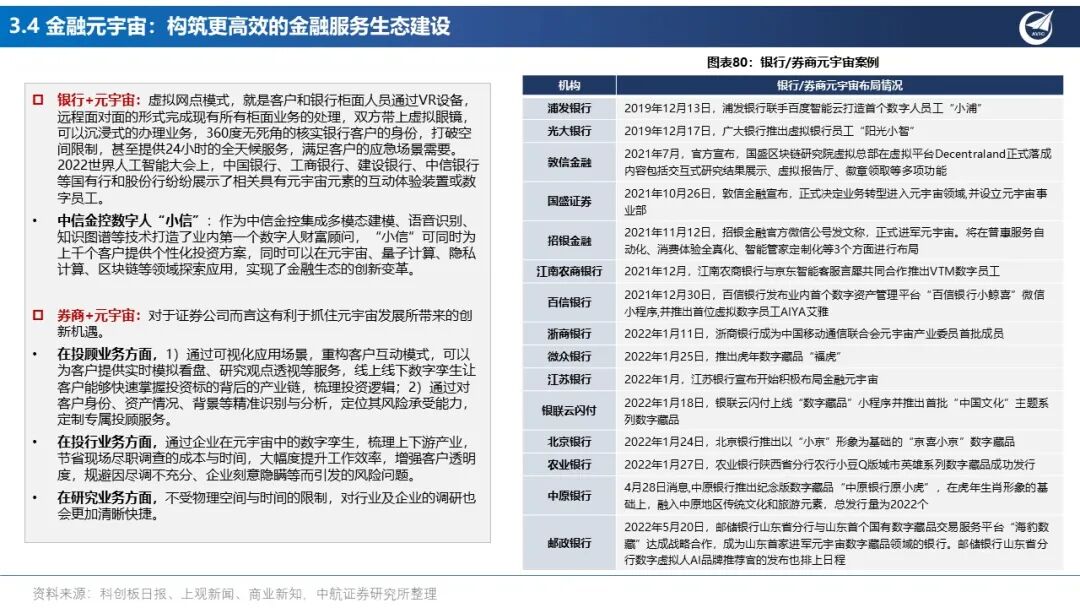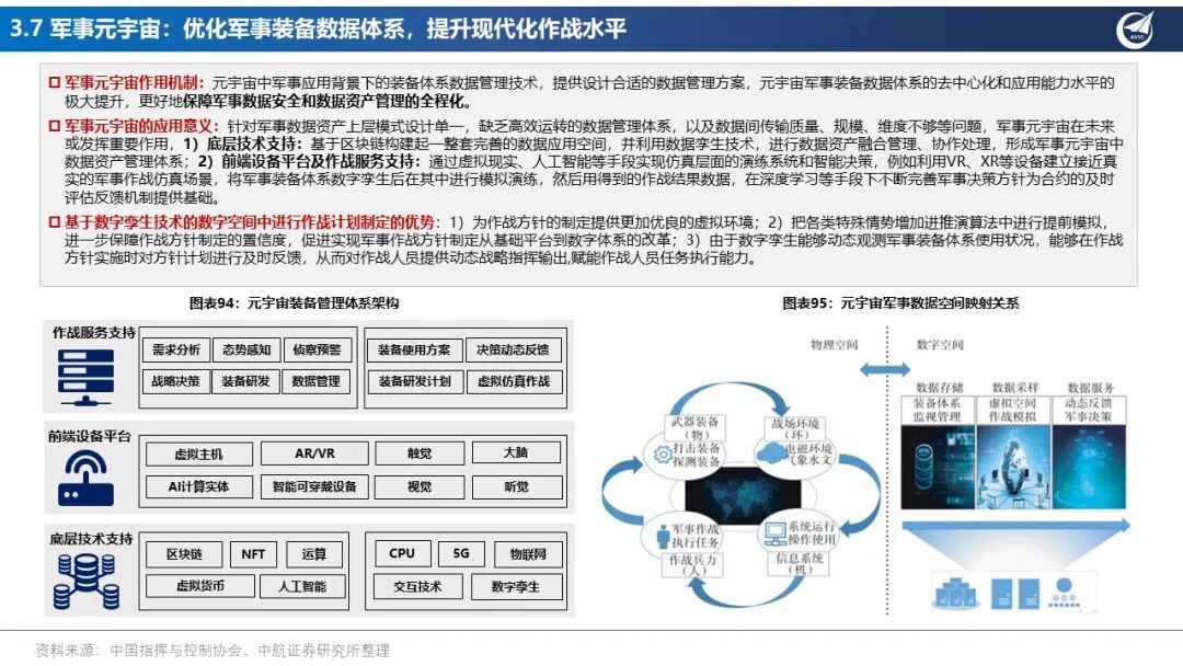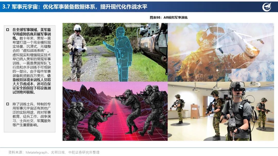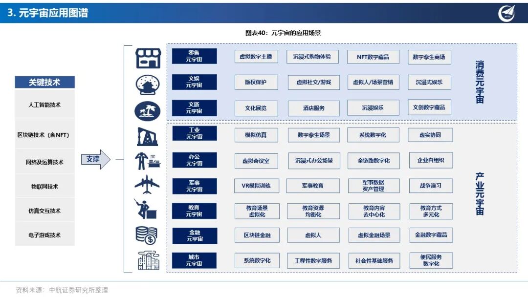 細分領域:1)金融元宇宙(區塊鏈金融、數字藏品、虛擬金融場景);2)教育元宇宙(教育場景虛擬化、教育內容去中心化);3)辦公元宇宙(虛擬會議室、沉浸式辦公場景、企業自組織);4)工業元宇宙(模擬仿真、系統數字化、虛實協同);5)軍事元宇宙(VR模擬訓練、軍事教育、戰爭演習)等。