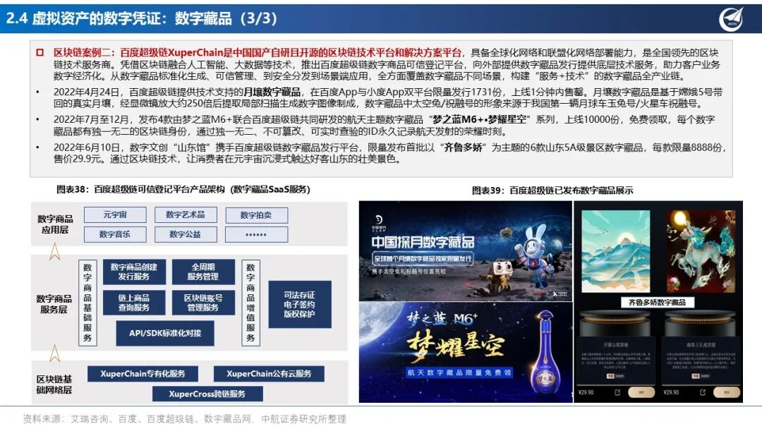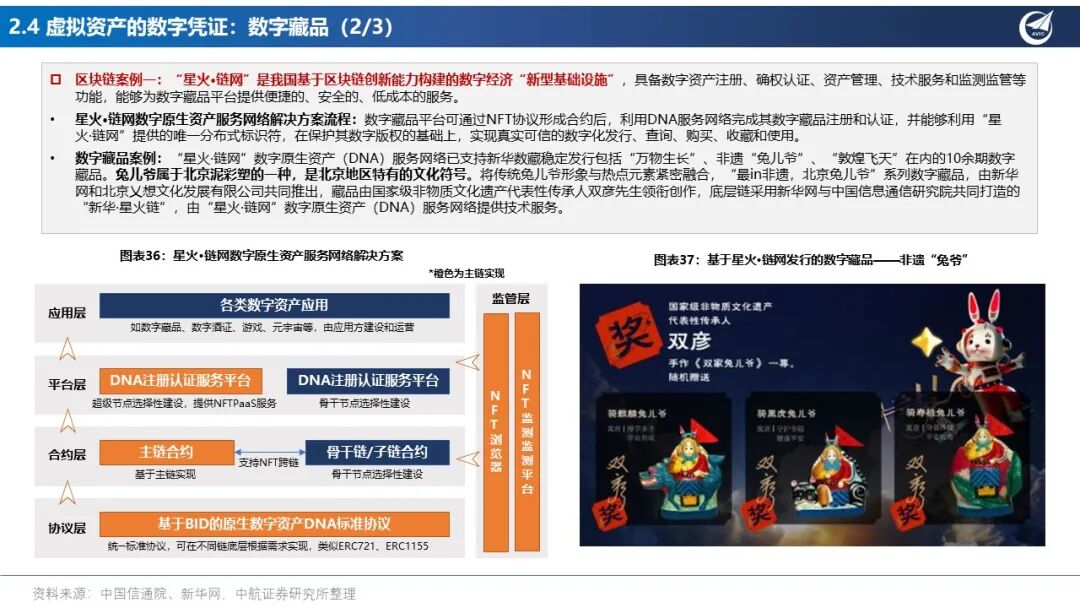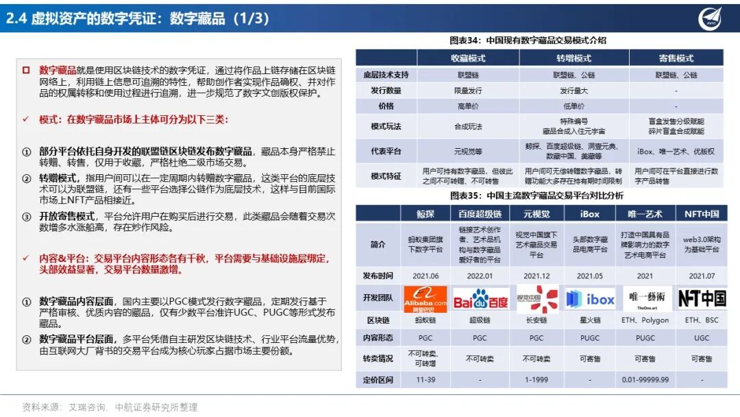 ④數字藏品/NFT(虛擬資產的數字憑證):1)定義:數字藏品就是使用區塊鏈技術的數字憑證,通過將作品上鏈存儲在區塊鏈網絡上,利用鏈上信息可追溯的特性,幫助創作者實現作品確權、并對作品的權屬轉移和使用過程進行追溯,進一步規范了數字文創版權保護。2)分類:可分為部分平臺依托自身開發的聯盟鏈區塊鏈、轉贈模式和開放寄售模式三類。