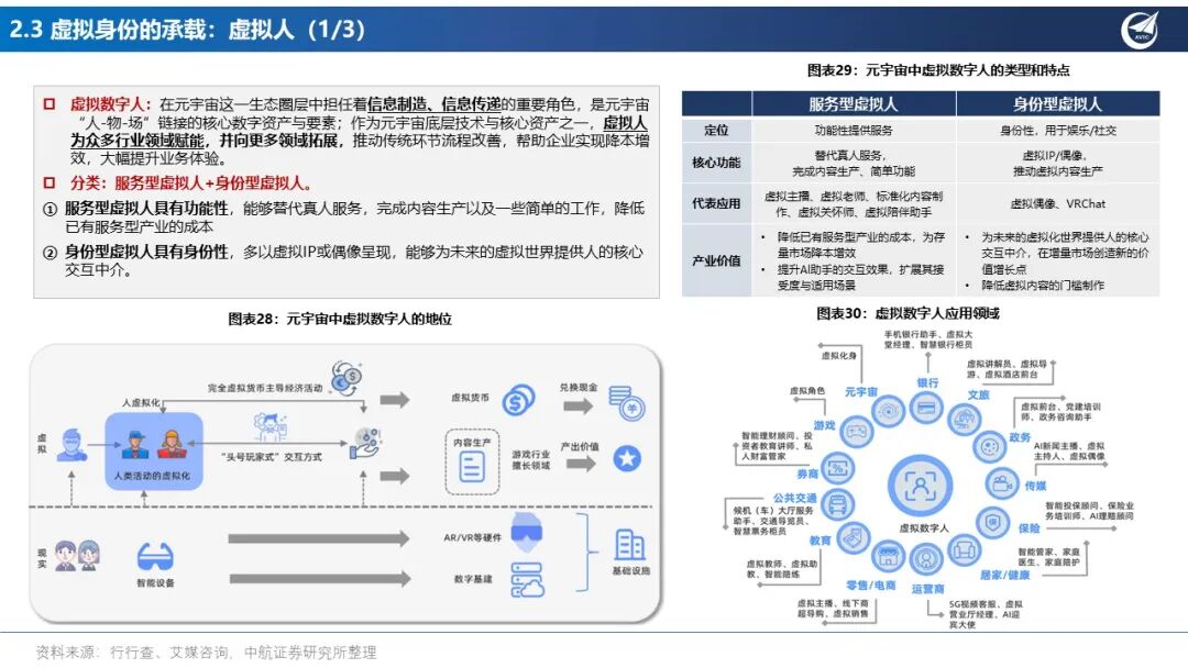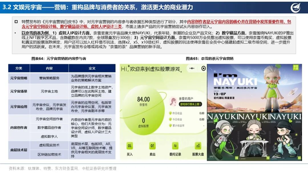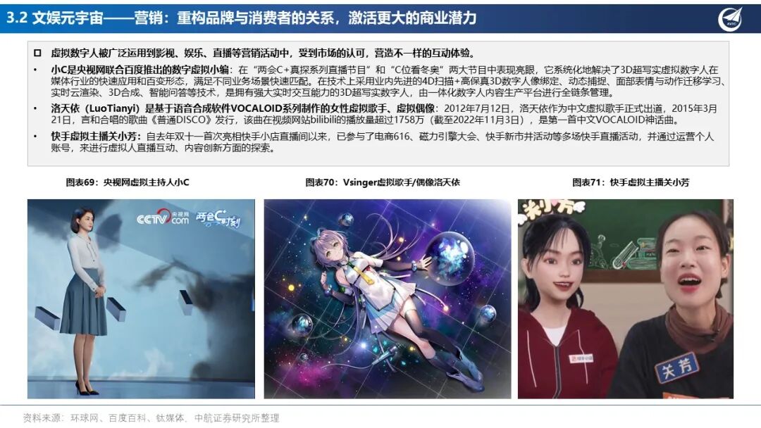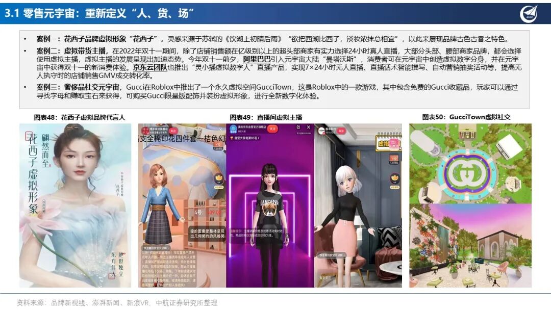 細分領域:1)零售元宇宙(虛擬數字主播/沉浸式購物體驗/數字孿生商場/數字藏品);2)文娛元宇宙(虛擬社交/游戲/營銷/虛擬人/虛擬演藝);3)文旅元宇宙(文化展覽/文創數字藏品/酒店服務)等。