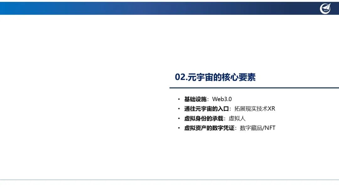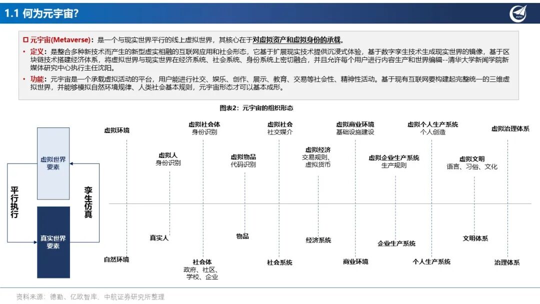 ①元宇宙 (Metaverse) :指的是一個與現實世界平行的線上虛擬世界,其核心在于對虛擬資產和虛擬身份的承載,用戶能在元宇宙中進行社交、娛樂、創作、展示、教育、交易等社會性、精神性活動,以此實現人類生存/感官維度的拓展,進而創造可復制和新增的全新經濟系統。