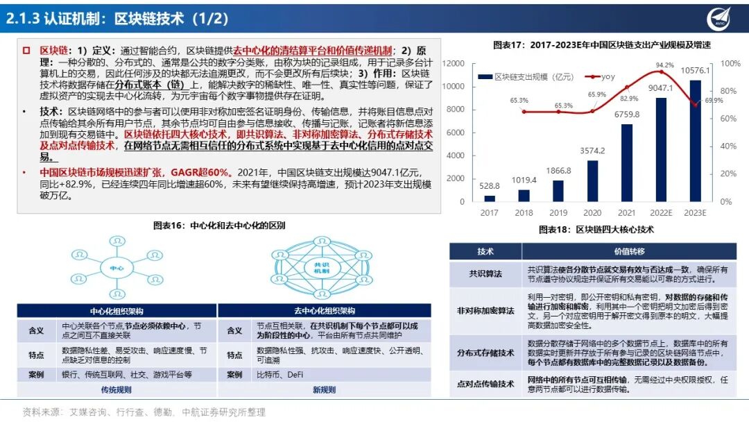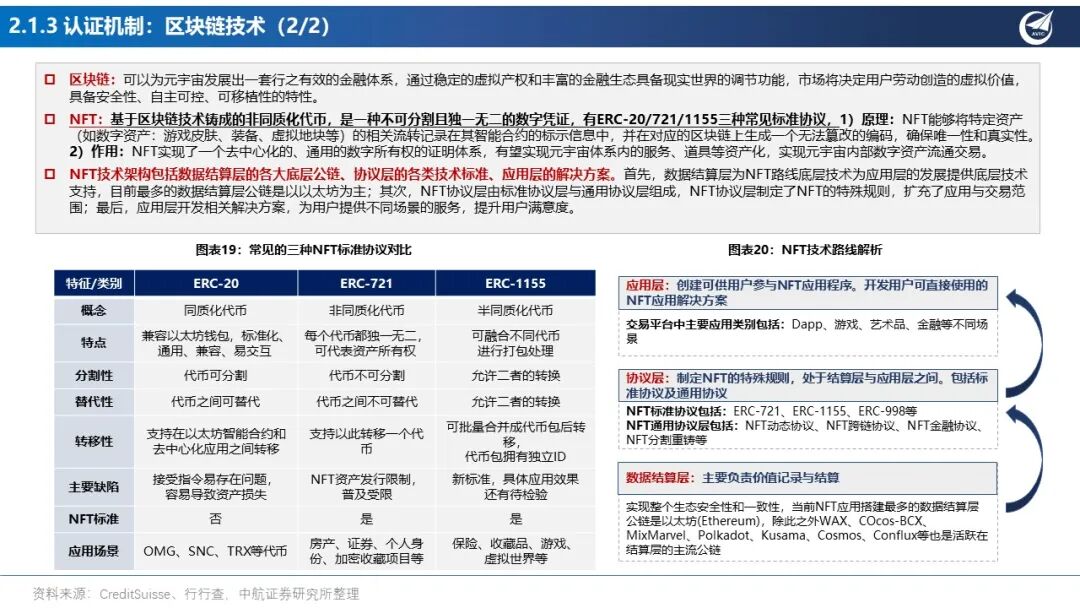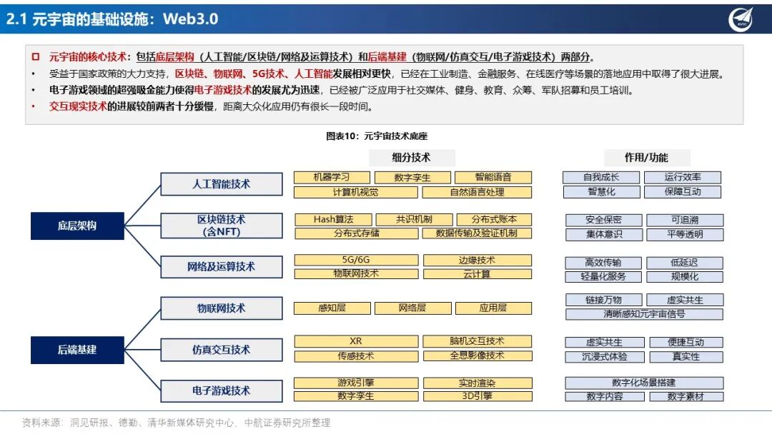 ①Web3.0(基礎設施):1)本質:基于區塊鏈的“去中心化”契約網絡,用戶創造、用戶所有、用戶控制、協議分配;2)技術支撐:通信基礎是5G技術,算力基礎是云計算技術,區塊鏈技術保障認證機制;3)意義:形成以分布式數據庫、加密技術、邊緣計算等底層技術加持的Web3.0時代網絡環境,是元宇宙實現的前提。