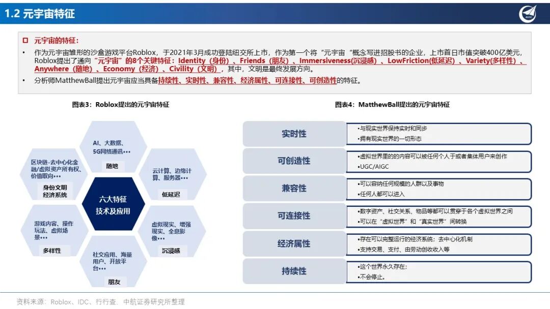 ②特征: Roblox提出了通向“元宇宙”的8個關鍵特征:Identity(身份)、Friends(朋友)、Immersiveness(沉浸感)、Low Friction(低延遲)、Variety(多樣性)、Anywhere(隨地)、Economy(經濟)、Civility(文明),其中,文明是最終發展方向。