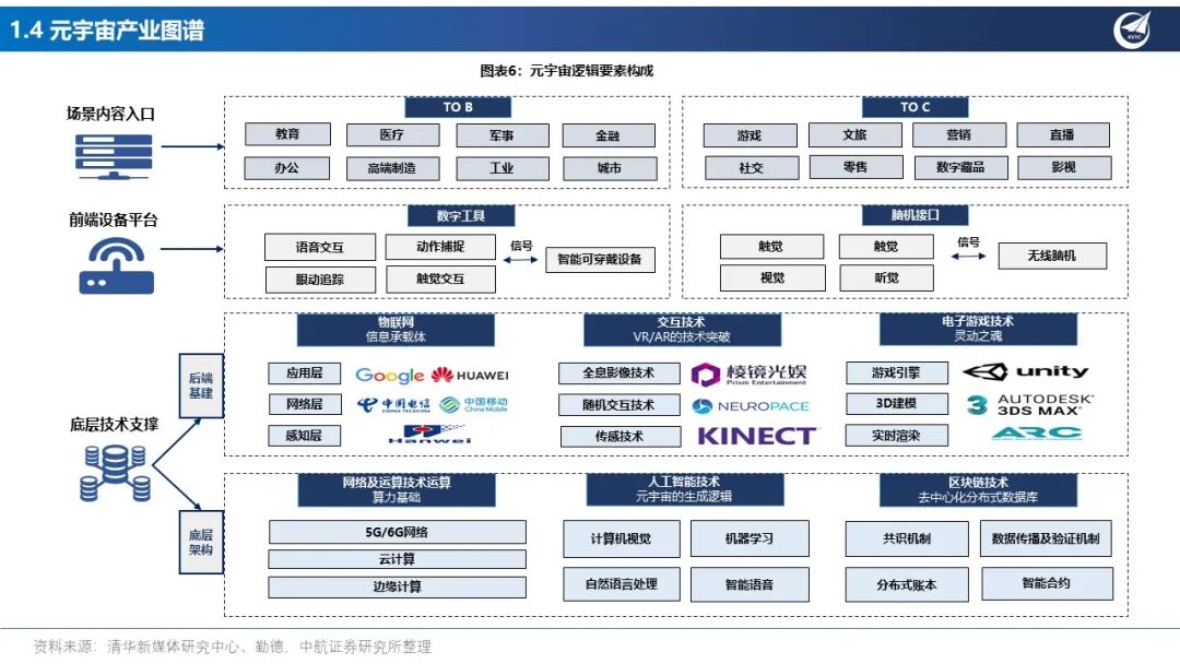 ④產業鏈:上游是提供底層技術的公司,中游是VR等設備生產商及供應商,下游是2B(教育、醫療、軍事、金融等)和2C(游戲、社交、文旅、零售等)的場景應用場景設計參與者。