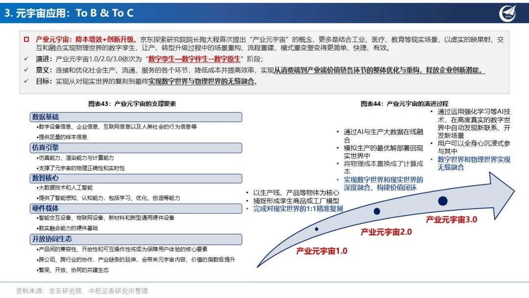 ①To B:產業業元宇宙“由虛向實”:產業元宇宙更多是結合工業、醫療、教育等現實場景,以虛實的映果射、交互和融合實現物理世界的數字孿生,讓產、轉型升級過程中的場景重構、流程重建、模式重變塑變得更簡單、快捷、有效。其中,工業領域是元宇宙應用于toB領域的第一片實踐沃土,工業元宇宙特指在工業領域,就是工業化和數字化、網絡化、智能保化融合的高級形態,為實現智能制造、無人操控、精益管理提供了新的工具箱。對比消費元宇宙,工業元宇宙更穩健,旨在創造一個高精度的數字孿生場景,把現實世界中的問題映射進元宇宙中,在元宇宙中仿真尋找解決方案,再把最優解部署回現實世界,關注解決確切場景中的具體問題,將覆蓋工業生產全鏈條環節。