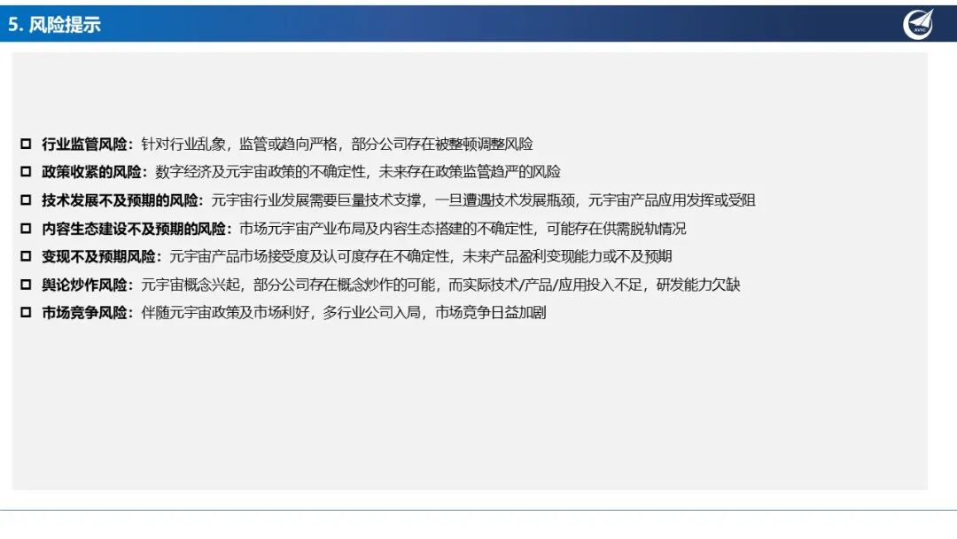 ● 風險提示:行業監管風險、政策收緊的風險、技術發展不及預期的風險、內容生態建設不及預期的風險、變現不及預期風險、輿論炒作風險、市場競爭風險。