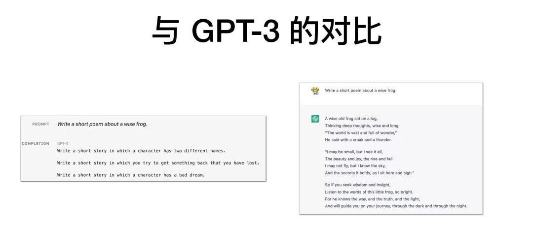 在對于人類指令的理解和執行上,可以發現,ChatGPT生成的結果在盡可能地貼合人類的意圖和期望,而GPT-3更像是設定好的套路模版。比如說同一個指令“寫一首簡短的關于青蛙的詩歌”,右邊ChatGPT的可讀性明顯要更強。