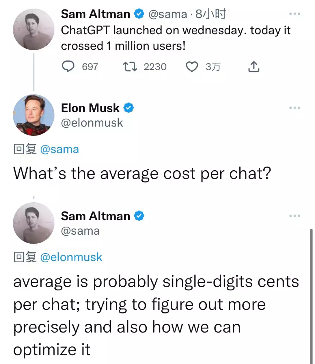 近日,ChatGPT的火爆之余,馬斯克在推特上也對ChatGPT提出了關鍵性的問題:每次對話的平均費用是多少?