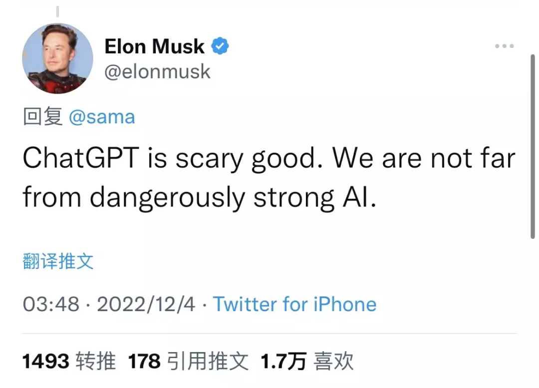 甚至于馬斯克也為其稱贊“ChatGPT非常好。我們離強大到危險的AI不遠了。”
