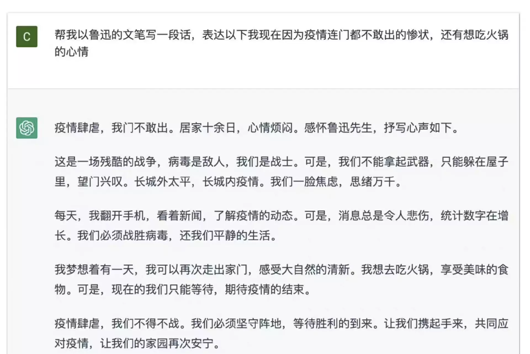 “幫我以魯迅的文筆寫一段話,表達一下我現在因為疫情連門都不敢出的慘狀,還有想吃火鍋的心情”,有網友在ChatGPT中輸入一段自己的需求。幾秒鐘后,ChatGPT就給出了一篇質量頗高的小作文。