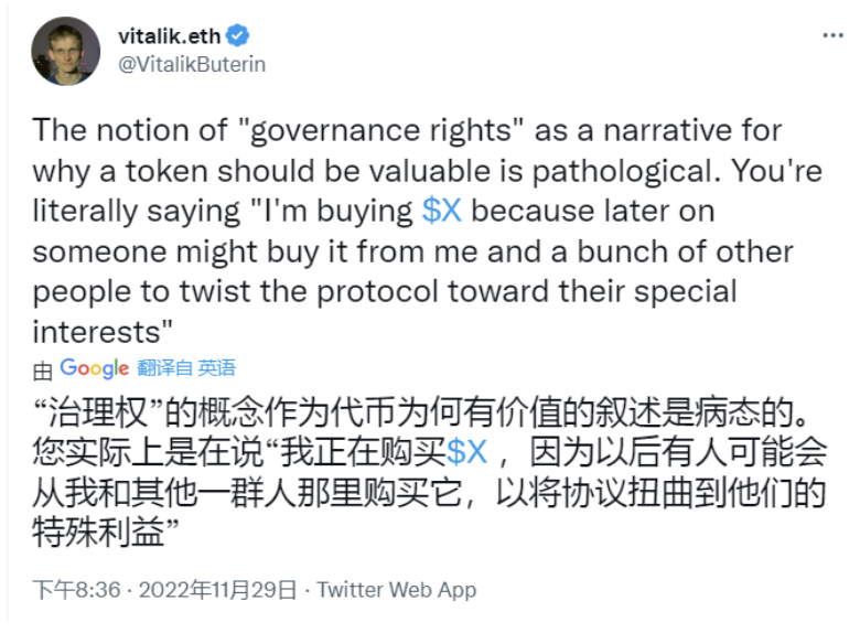 11月29日,Vitalik Buterin發布推文對治理代幣的價值敘事進行了批評。他認為,“用治理權的概念來解釋代幣的價值作為一種敘事是病態的。對于普通人來說,花500美元獲得0.0001%的機會來影響一些投票的結果,這并不是一個好的交易。只有千萬富翁和對沖基金(包括攻擊者)才認為這是一筆不錯的交易。”