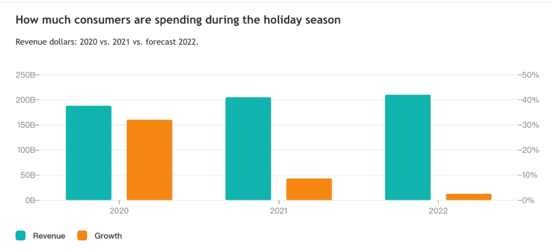 比起去年靜悄悄的黒五,北美各地的節日氣氛已經回到了疫情前。根據全美零售聯合會追蹤實體店和網上購物數據的一項調查,從感恩節到網絡星期一,購物者的數量創下歷史新高,接近2億購物者涌回商店。該機構預計,今年假日季的銷售額將比去年增長6% 至 8% ,達到 9426 億美元至 9604 億美元。
