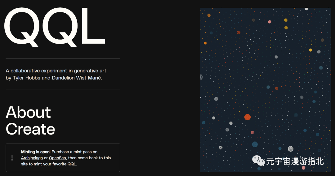 QQL是一個生成藝術的實驗項目,由Tyler Hobbs & Dandelion Wist合作。就算你沒有QQL NFT,也可以上https://qql.art/鏈上動動手指生成藝術,但是你需要持有 QQL Mint Pass (https://opensea.io/collection/qql-mint-pass) 才可以將自己生成藝術鑄造出來。