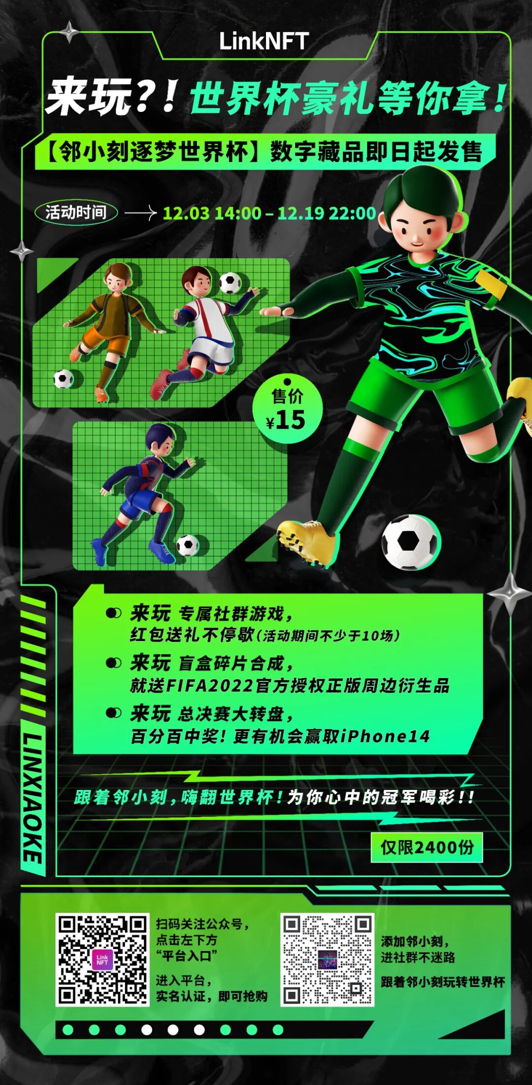 到底哪支球隊可以問鼎金杯?如果你和我一樣期待,那么就不要錯過這次的球迷大狂歡項目——【鄰小刻逐夢世界杯】系列數字藏品,12月3日14:00——12月19日22:00與鄰小刻一起為縱橫球場、叱咤風云的球員們助威,為世界杯喝彩!