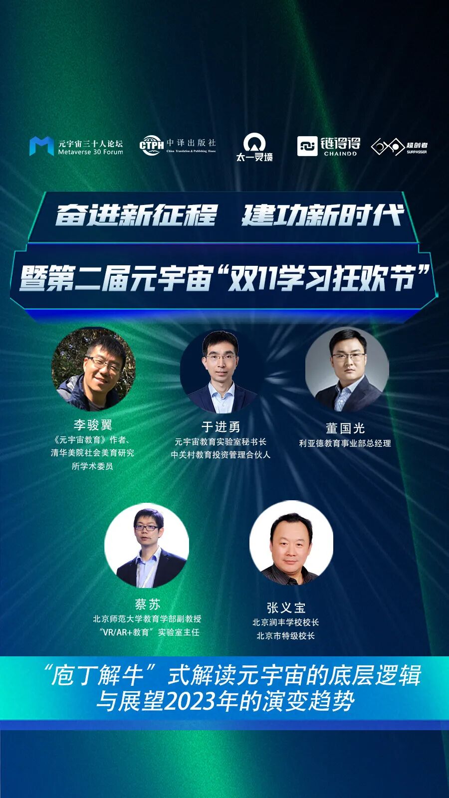 2022年11月1日,由元宇宙三十人論壇、中譯出版社、鈦媒體·鏈得得、太一靈境、超創者共同舉辦的“奮進新征程,建功新時代”2022年第二屆元宇宙“雙十一學習狂歡節”正式開幕。本次學習節連續11天,邀請《元宇宙》系列叢書20多位作者,攜手近60位行業專家,探討內容覆蓋了碳中和、金融、科技、產業、教育、傳播、藝術等多個角度,詳細詮釋了元宇宙的內涵和本質,“庖丁解牛”式地解讀市場的深刻變化與元宇宙的底層邏輯,展望2023年乃至未來五年的最新發展與演變趨勢。