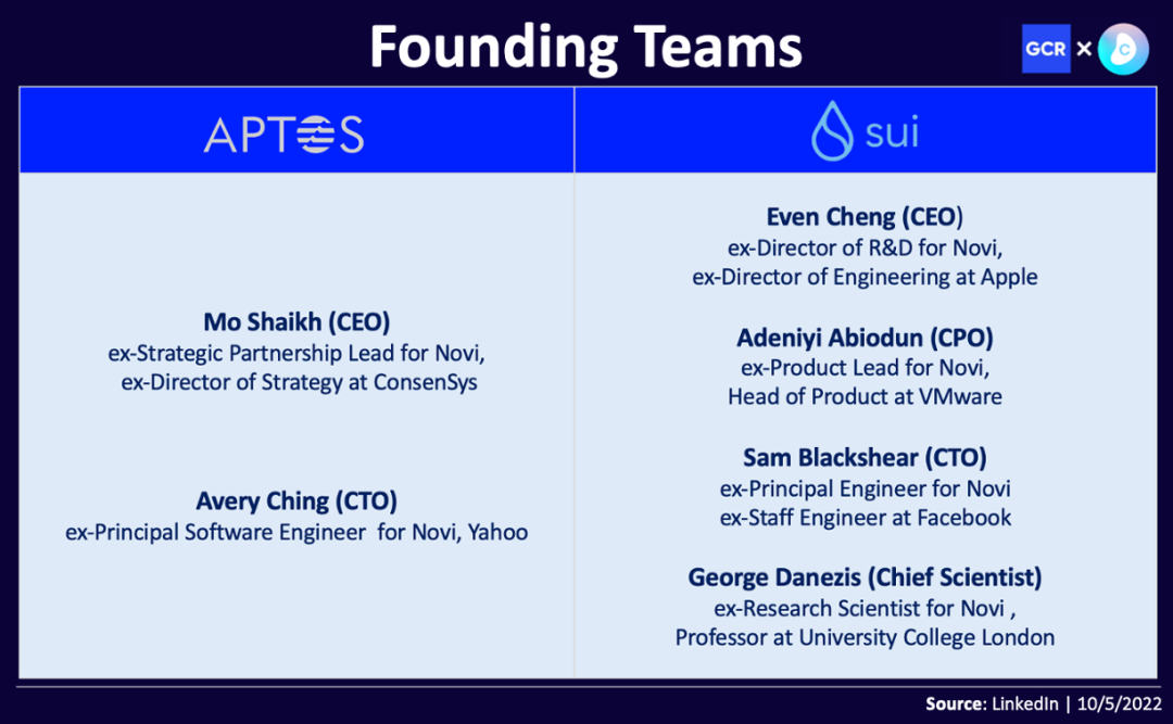 Aptos 和 Sui 的創始團隊都深深扎根于 Diem 和 Novi 項目。不可否認的是,這兩個項目都具備執行超過40億美元估值的愿景的技術能力。毫無疑問,這兩個團隊都有很強的創始人-市場契合度。Mysten Labs 團隊包括 MOVE 編程語言白皮書的兩位合著者,以及來自 Novi/Diem 團隊的更多研發力量。作為 Aptos Labs 的首席執行官,Mo Shaikh 帶來了業務發展和合作伙伴關系——對于任何希望在不斷增長的L1市場中獲得吸引力的新協議來說,這是一個重要的方面。這是 Solana 和 Polygon 在上個周期與 NEAR 和 Algorand 等更注重技術的協議的明顯區別。Aptos 還引進了幾位 Solana 前員工,包括Solana的前市場營銷主管,他們有擴展替代L1的第一手經驗,來推動 Aptos 生態系統。上圖:Aptos (左) 和 Sui (右) 的創始團隊成員
