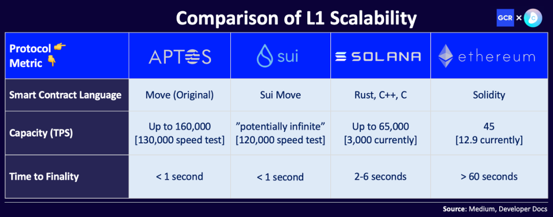 上圖:Aptos、Sui、Solana 和以太坊的智能合約語言、TPS (每秒吞吐量) 以及實現最終敲定所需的時間