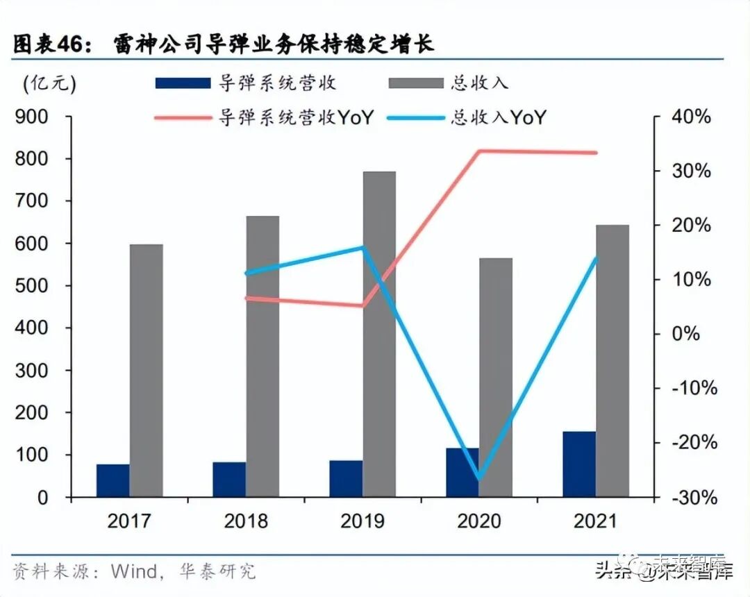 導彈武器系統技術裝備水平反映了一個國家的綜合國防實力。一方面,導彈武器系統非常 復雜,是推進劑學、電子學、金屬材料學、自動控制學、無線電學、光學、流體力學、空 氣動力學和發動機學等多學科先進科學技術結合的結果;另一方面,先進的導彈裝備技術 水平需要大量的經費支撐,是一國綜合國防實力的體現。我國導彈技術已處于世界前列。目前我國的導彈武器已形成系列,具有先進性能的多種型號導彈,導彈系列齊全。導彈的耗材屬性,產品效果優勢和擴產難度低三方面決定了導彈產業是當前軍工板塊的較 優投資細分賽道。首先,從產品屬性來看,導彈屬于一次性耗材,使用即消失。為了應對 戰爭需求,需要維持一定規模的安全庫存;同時導彈一直是國際軍火巨頭的主要收入來源, 也是國際軍貿上的最主要的貿易品種之一。目前導彈的消耗方式除正常戰爭需求外,還有 實彈演練以及日常因老化等原因的銷毀等,當前我國的導彈消耗集中在后兩者。2021 年 1 號《訓令》強調:全面提高訓練實戰化水平和打贏能力。6 月 24 日國防部半年新聞發布會 中披露全軍上半年軍事訓練彈藥消耗量同比大幅增加。從導彈相關標的的收入來看,近年來洛克希德·馬丁和雷神公司(現為雷神技術公司)導 彈業務的營收均保持了增長,其中洛克希德·馬丁公司的導彈和火控收入板塊的增速從 2018 年開始超過整體公司收入,在 2018 年和 2019 年均保持在 15%以上。雷神公司導彈業務收 入增速 2020-2021 年保持在 30%以上。
