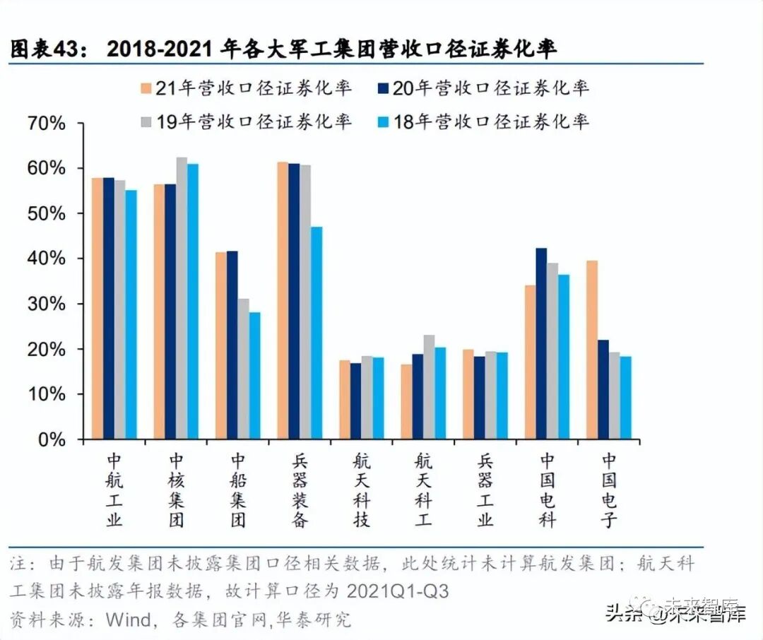 相比美國成熟的軍工體系,我國軍工整體資產證券化率仍然較低。據 2021 年各軍工集團年 報數據測算,總資產口徑下我國軍工集團整體資產證券化率 44%左右,除中航工業、中核 集團、兵器裝備集團之外,其他各大軍工集團資產證券化率均處于較低水平。截至 2021 年 底:中航工業走在前列,以總資產口徑計的資產證券化率達到 82%,營收口徑計的資產證 券化率為 58%;而兩大航天集團,航天科技和航天科工,相對較低,仍有較多的資產分布 在上市公司體外。