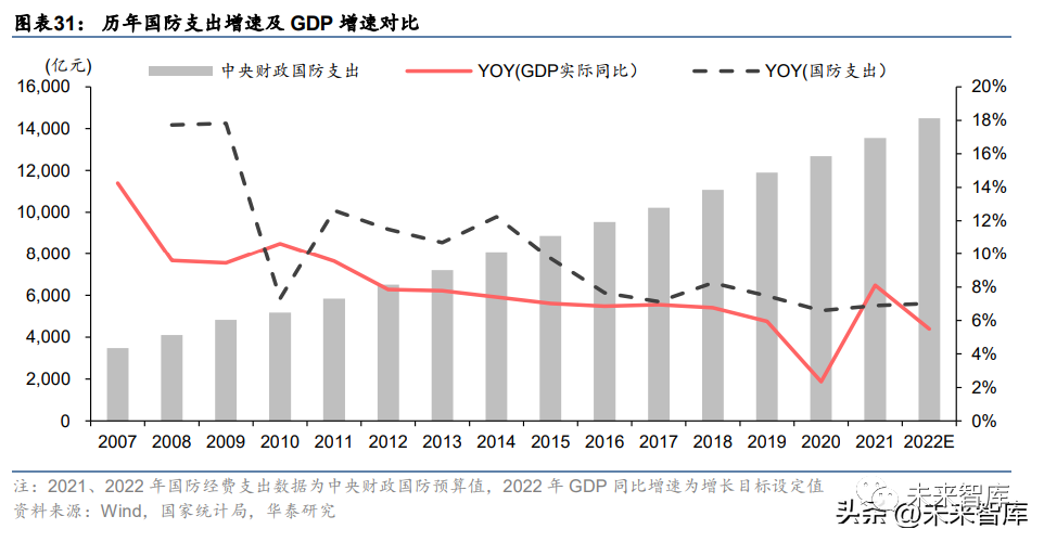 對比“北約”相關方,我國國防支出仍有較大提升空間,目前國防支出與經濟地位仍不相 稱,2021 年國防支出占當年 GDP 比重為 1.19%。“十四五”規劃中明確指出“促進國防實 力和經濟實力同步提升”,我們認為整個“十四五”時期甚至到 2027 年“實現建軍百年奮 斗目標”的節點上,我國國防支出增速或將長期高于 GDP 增速,國防支出占 GDP 比重有 望進一步提升。