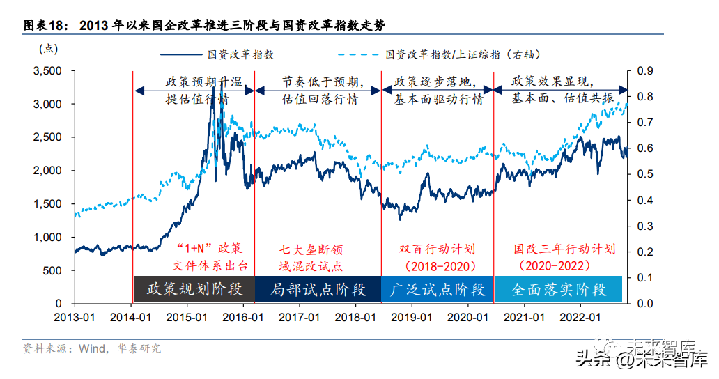 2008 年金融危機后,我國經濟增長模式逐步邁入新階段,國企改革的重要性日漸提升,黨 的十八大以來,黨中央對國企改革作出戰略布局,加強頂層設計,2014 年以來,國企改革 的“1+N”政策文件體系陸續醞釀并出臺,為新時代國企改革搭建了“四梁八柱”,此后國 企改革按照有序的節奏鋪開。總體來看,國企改革可以大致劃分為四個階段:1)2014-2016,政策規劃階段:地方國企改革規劃疊加“1+N”政策文件體系出臺,意味 著國改頂層設計基本完成。在此期間,國企改革預期不斷升溫,主題投資逐漸達到高潮。2)2016-2018,局部試點階段:以七大壟斷領域(電力、石油、天然氣、鐵路、民航、電 信、軍工)混改試點為代表,涌現了中國聯通 、東航物流 等經典的混改案例,意味著混改邁出實質性步伐。在此期間,由于國改作為復雜的系統, 實際推進難度較大,2016 年僅僅提出少數領域的混改試點,使得市場認為節奏低于預期。3)2018-2020,廣泛試點階段:2018 年 10 月,雙百行動計劃出臺,意味著國企改革不再 是少數企業的試點,而是國企只要有改革的意愿和決心,都可以納入試點名單,混改進入 了廣泛試點階段,再次向前邁出一大步。4)2020-2022,全面落實階段:2020 年全國兩會提出實施國企改革三年行動計劃,關鍵詞 在于落實,并基本解決國企的辦社會等歷史遺留問題。