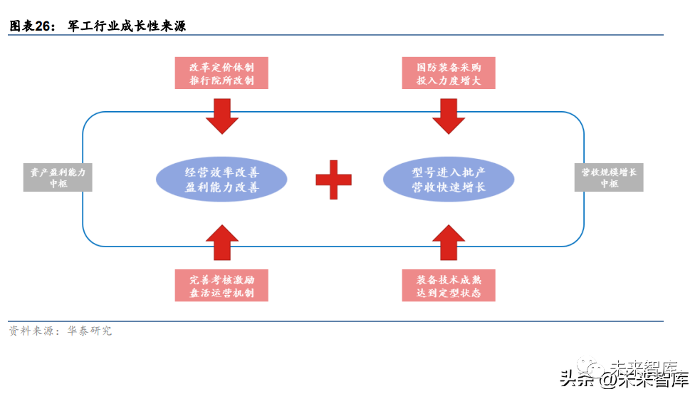 沒有完成時只有進行時,國企改革永遠在路上。軍工行業成長性的來源是兩條主線:一條 是營收規模的增長,一條是資產盈利能力的提升,行業的成長必然是兩條腿走路的結果。國企改革的目的就是把劣勢轉換為優勢,利用生產關系的改變來促進生產力的進步,我們 認為積累了技術和掌握資源優勢的國有企業,在三年國改行動落實后,若經營體制改革進 展順利,盈利能力會有較大改善,將釋放較大的技術紅利和發展紅利。
