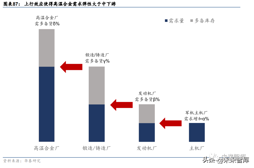 “上行效應”使得上游高溫合金端需求彈性大于中下游。產業鏈自下而上各階段備庫需求 會逐級放大企業業績彈性,對于中上游材料端具有放大效應。假設軍機主機廠需求增長α%, 那么發動機廠在滿足α%之外,仍需多備β%的庫存。而鍛造/鑄造廠在滿足發動機廠新增 的(α+β)%的需求外,需多備γ%的庫存,上行效應在最終作用到高溫合金廠時,高溫合 金廠產量增加(α+β+γ+δ)%,可以看出備庫需求使得上游需求彈性大于中游,中游需求 彈性大于下游。
