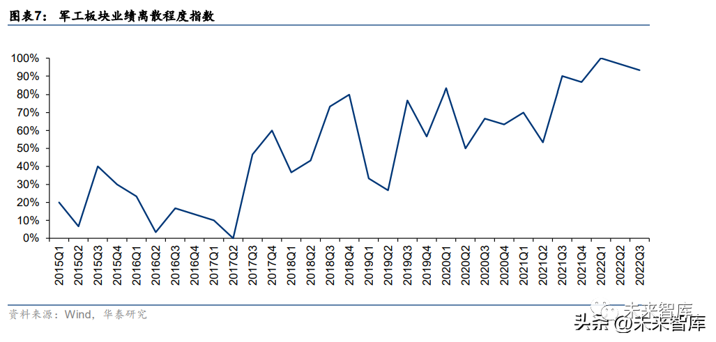 22Q1-Q3 業績離散度處于 2015 年以來高位,軍工板塊各賽道景氣分化加劇。自“十四五” 裝備批量采購訂單于 2020-2021 年逐步落地后,2021 年軍工相關企業迎來普遍性業績高增 長,其中部分企業高增的內因是細分行業受益于裝備列裝放量帶來的持續性業績釋放,而 部分企業短期業績受下游一次性備貨等因素帶動,具有一定波動性與周期性。進入 2022 年, 軍工行業各賽道景氣分化加劇,通過構建各軍工企業單季度凈利潤增速離散度指數,我們 發現 2022Q1-Q3 為軍工板塊業績分化高點。展望 2023 年,在目前的作戰體系以及不同的 需求規劃下,各細分領域的成長性或將進一步分化。