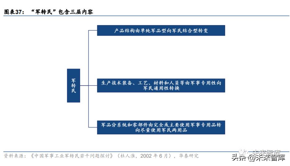 構建靈活高效、競爭開放的工作制度,軍民融合趨勢或將進一步加強。2021 年發布的修訂 版《軍隊裝備條例》圍繞落實需求牽引規劃、規劃主導資源配置的要求,完善了裝備領域 需求、規劃、預算、執行、評估的戰略管理鏈路;立足破解制約裝備建設的矛盾問題,構 建了靈活高效、競爭開放、激勵創新、規范有序的工作制度。軍轉民方面,軍工集團強調 保軍和核心能力建設,在保障國家戰略、國防安全和完成重大專項任務的前提下,會進一 步推進民品開發和軍工科技成果轉化,但在促進軍民技術相互支撐、有效轉化方面仍需政 策與時間支持。軍轉民主要集中在核、衛星及應用、北斗信息化、民用飛機、高技術船舶 和海洋工程、網絡安全等市場空間較大的領域。
