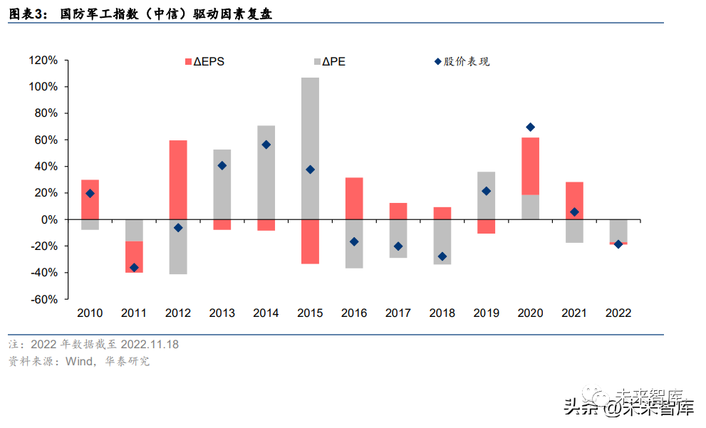 2010 年以來軍工板塊投資邏輯幾變,鑒于軍工裝備大多以 5 年為一周期,且與宏觀國家發 展規劃密切相關,可大致劃分為三大階段:1)“十二五”主題炒作驅動期(2011-2015):軍工企業資產證券化啟動板塊行情;軍改預期下景氣攀頂;2015 年 Q4 市場場外配資再度 活躍,杠桿高達 5 倍,進一步加溫軍工熱潮;2)“十三五”邏輯調整期(2016-2020):板 塊估值消化期+“股災”后市場風險偏好收緊期+板塊結構改革期,三期交疊壓制軍工行情, 階段性交易機會偶現;3)“十四五”價值成長驅動期(2021-至今):“十四五”規劃軍工發 展新周期,企業業績釋放,板塊證券化提升,龍頭盈利指引逐步清晰。2021 年軍工板塊投 資邏輯及實際驅動因素已轉變為業績驅動,2022Q1-Q3 多種外部因素沖擊市場風險偏好, 軍工板塊持續殺估值。